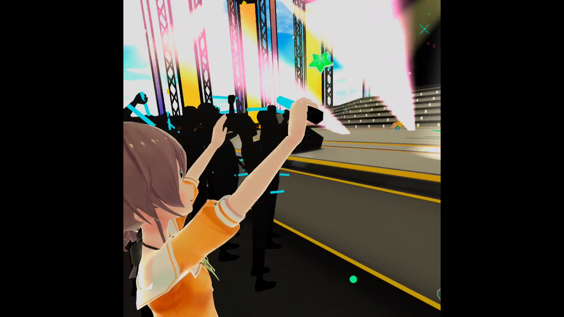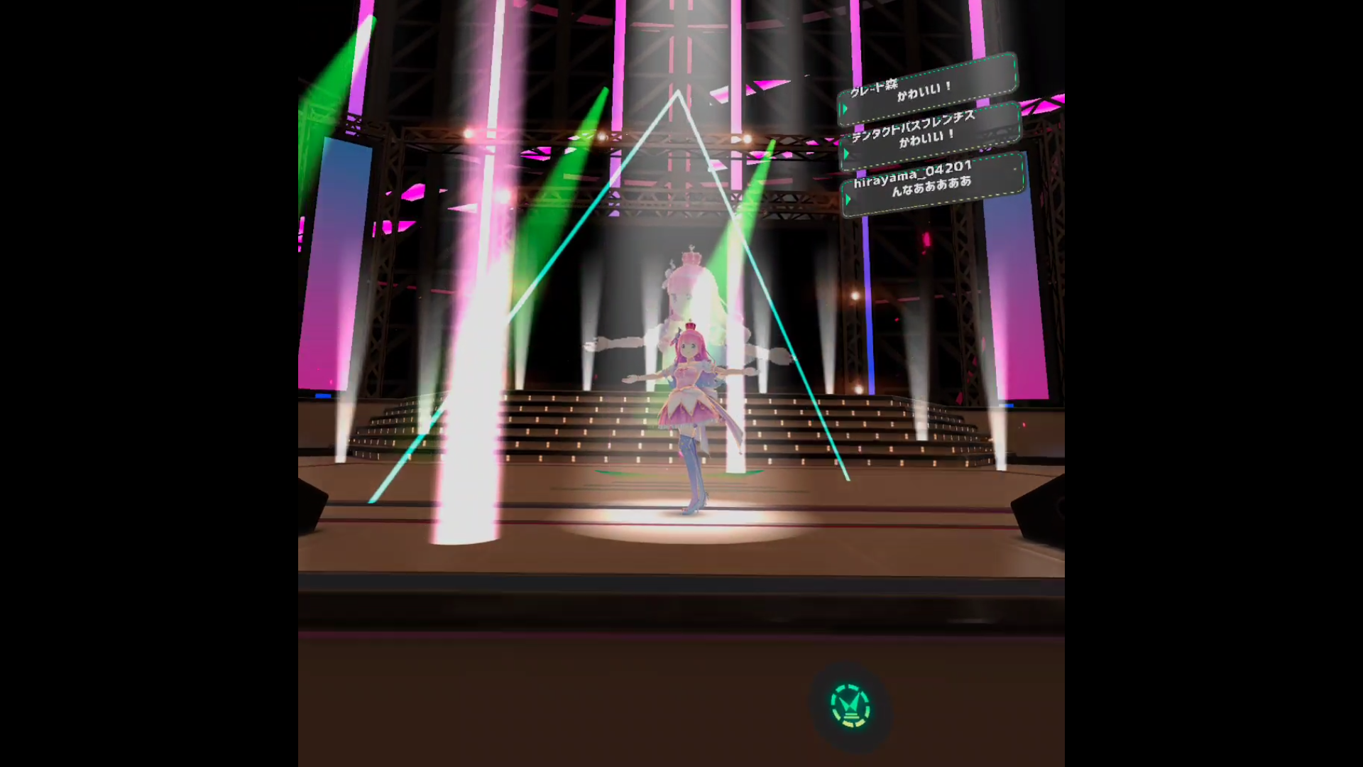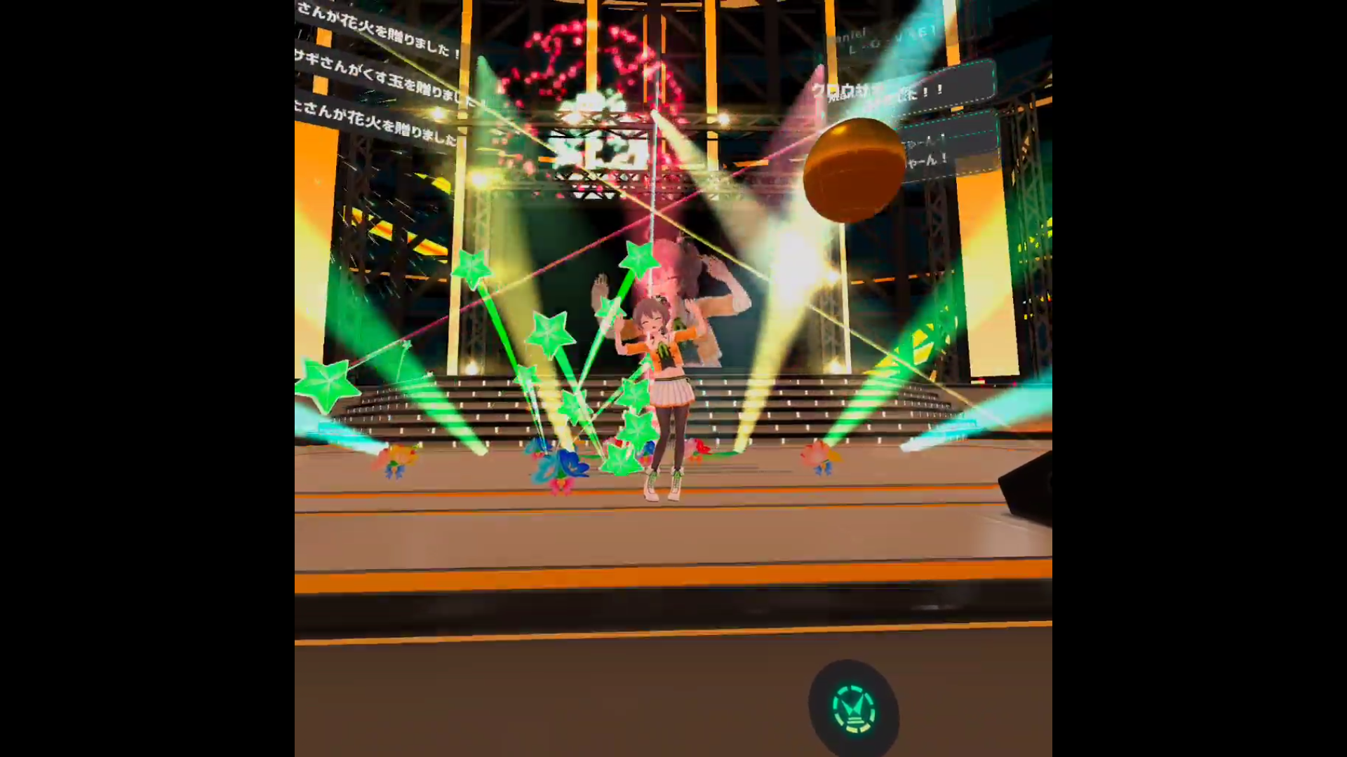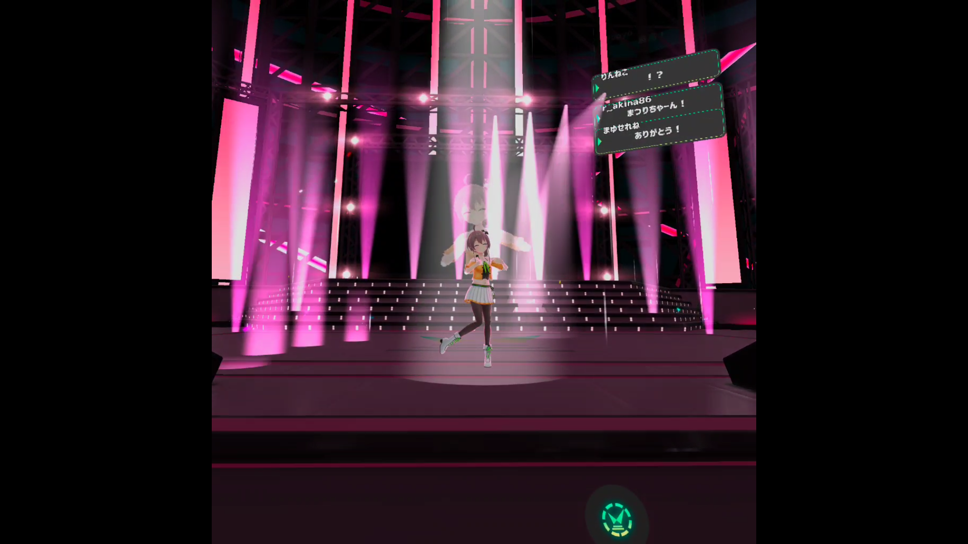 「今日はね。精一杯、歌って踊って!みんなを盛り上げていくのだよ~」と宣言した後の1曲目は、テレビアニメ「Dr.スランプ アラレちゃん」のオープニングテーマ「ワイワイワールド」。曲に合わせて左右にステップしたり、お尻を降ったりしながら独特の甘く可愛い声で歌っていく。「んちゃ! ルーナだよ」というセリフで歌い終えた瞬間、隣のまつりさんが「ルーナ~最高だ~」と心の声を代弁。さらに「可愛かったよ~。最高だった」と絶賛していたと思ったら、急にこちらを振り向き、「ね!」と同意を求めてくる。思わず、VRヘッドセットを被ったまま、頷きそうになってしまった。