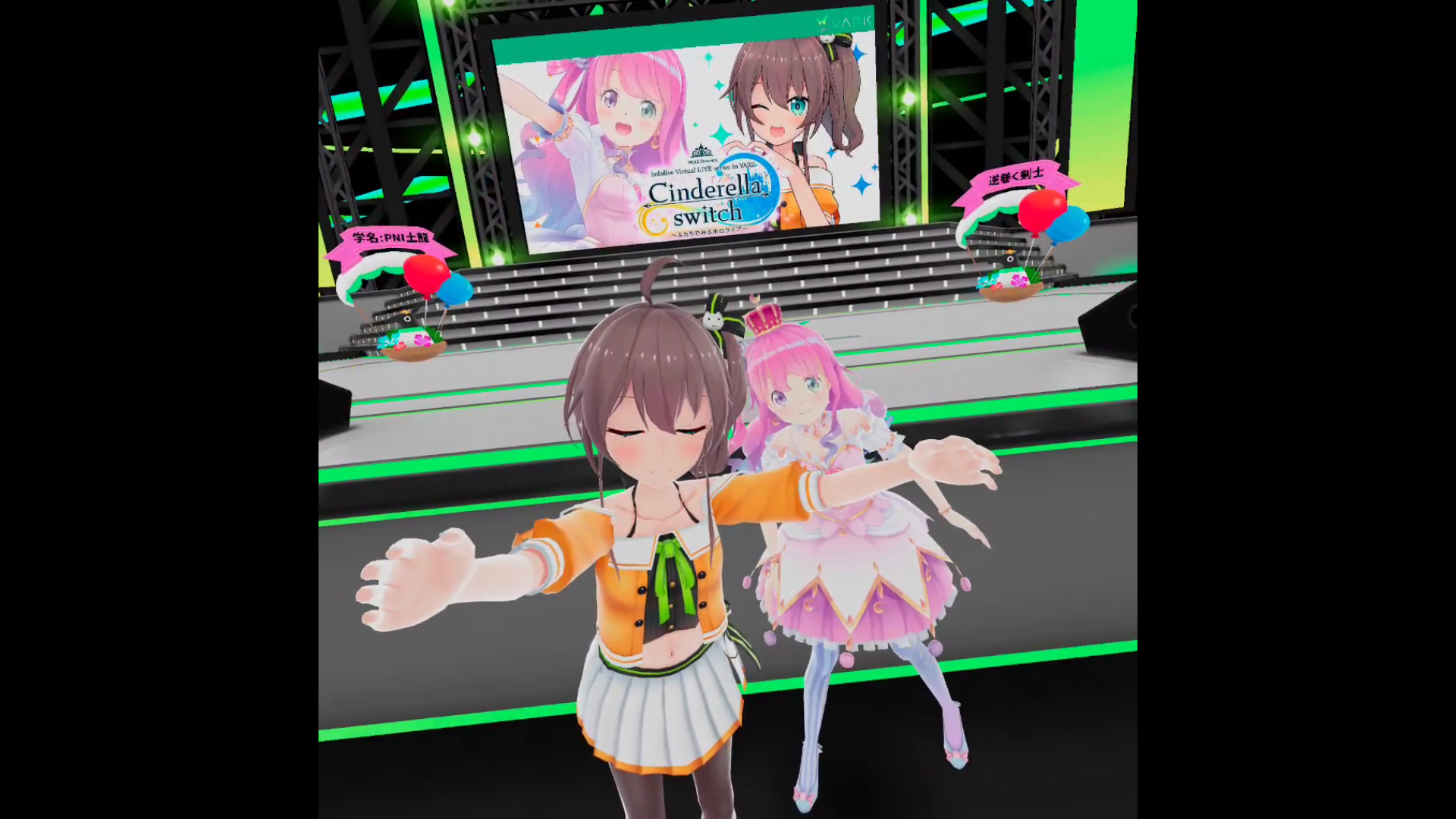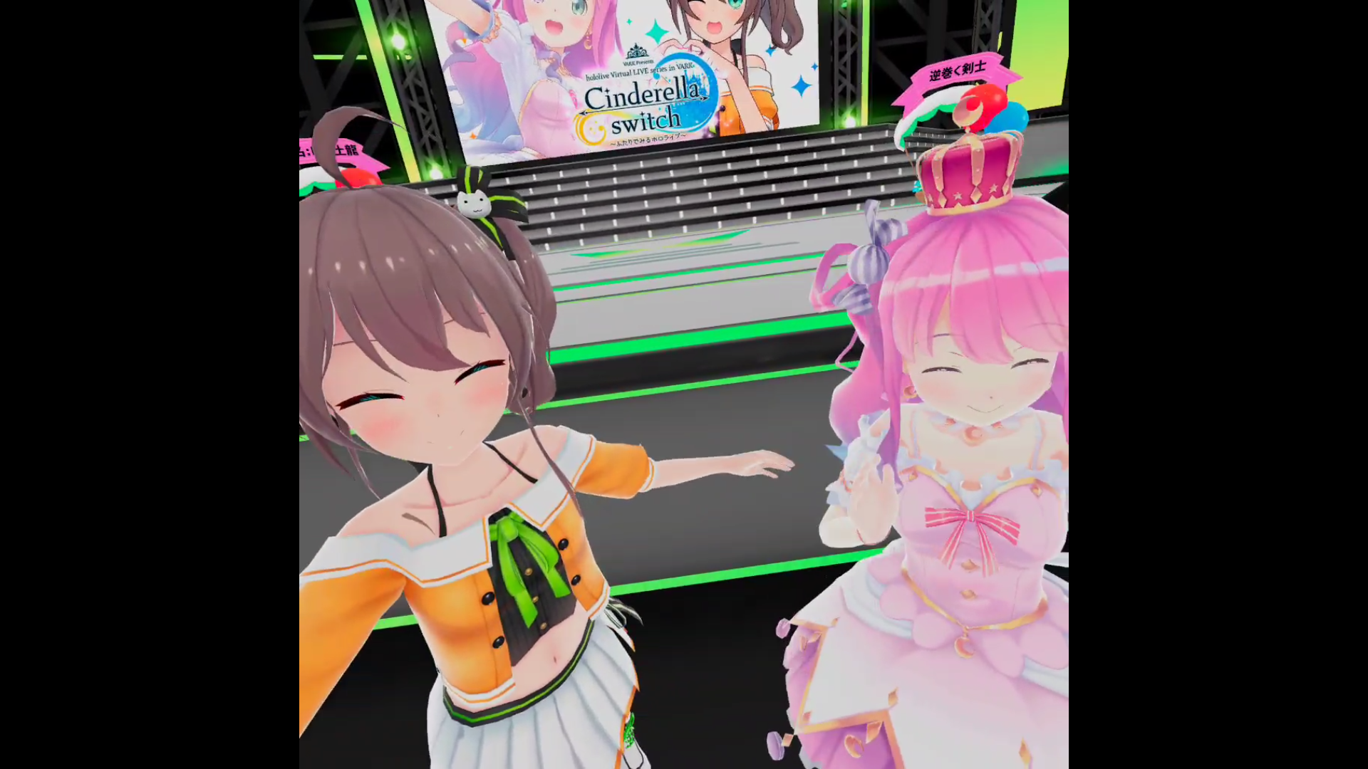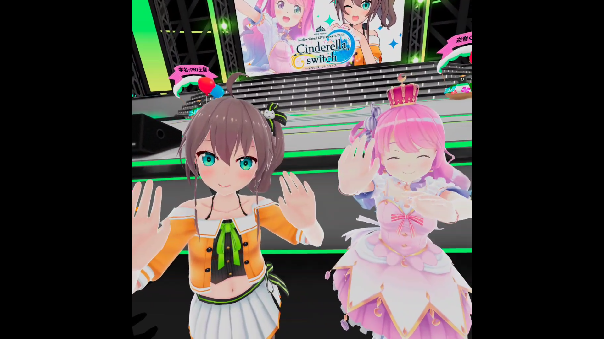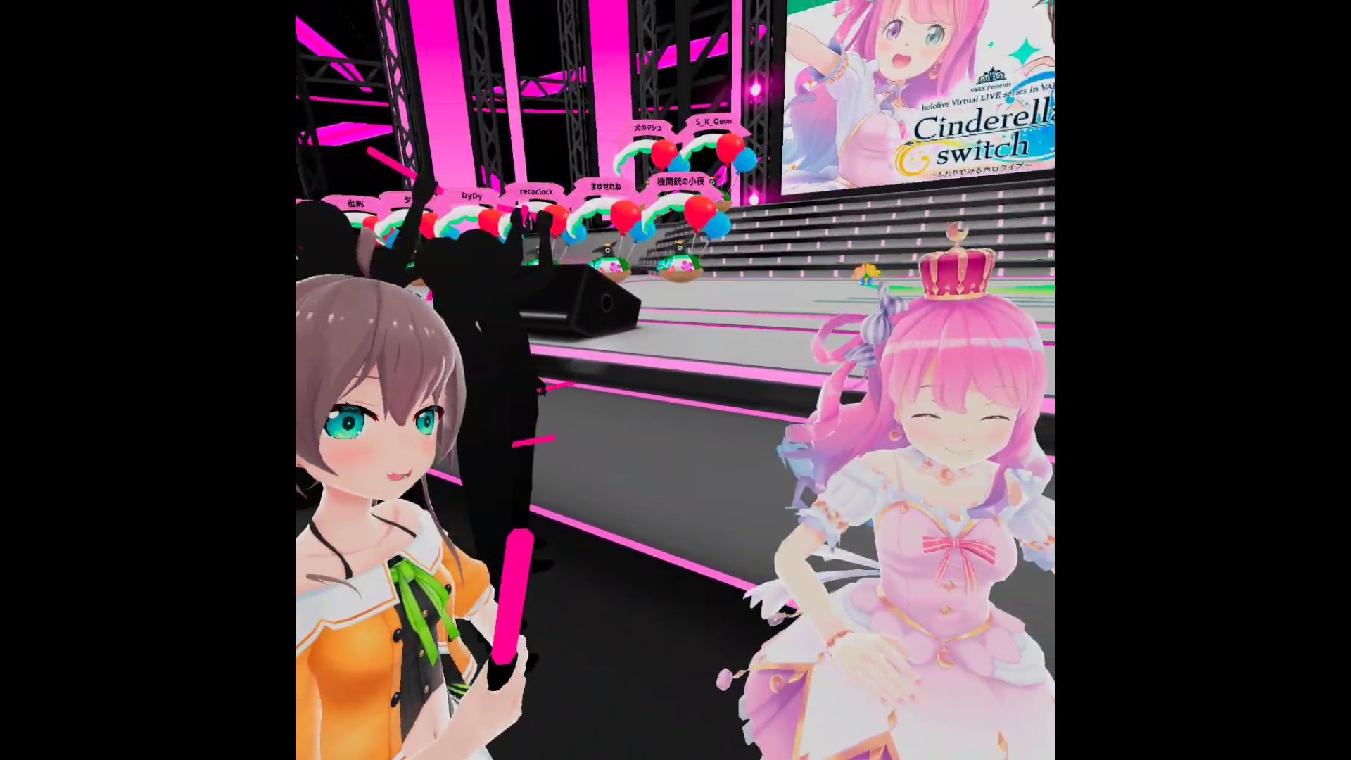 1部と2部、そして通し券購入特典のアフタートークで構成される「Cinderella switch ~ふたりでみるホロライブ~」。1部が開幕すると、客席の最前列に立つ筆者のすぐ左隣にピンク色のペンライトを持ったまつりさんが登場。「まつり、こういうライブ、久しぶりだからすごいドキドキしてて、緊張してるんだけど。一緒に観てくれる? 楽しもうね!」と笑顔で話しかけてくれる。さすがVR空間。ソーシャルディスタンスもお構いなしの距離感だ。