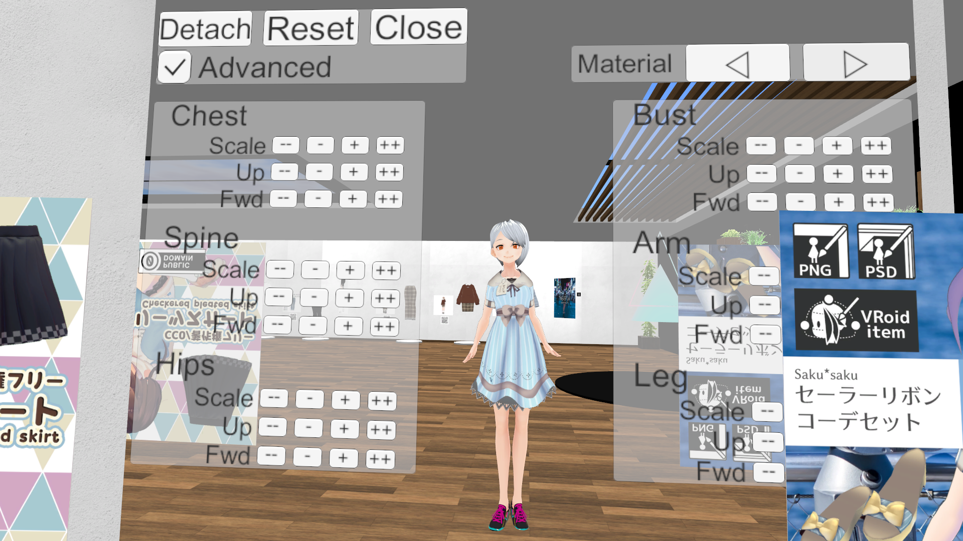 まず、ワールドへ訪れる際は、ギミックの仕様上、試着衣装の貫通を避けるため薄着のアバターの用意を推奨している。VRoidユーザーの場合、体型編集で肌テクスチャーにインポートするタイプの肌着を着用しておけば、貫通の問題はないだろう。