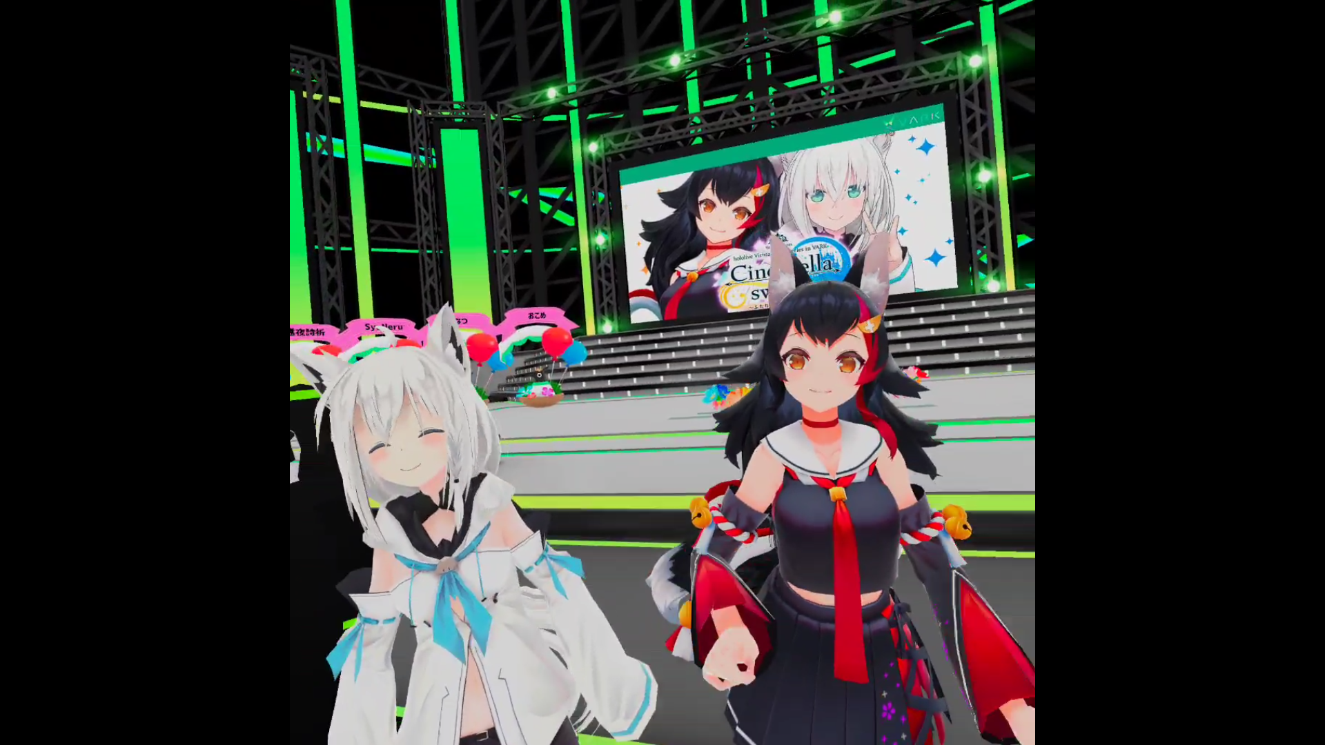 まずは、フブキさんのソロライブをミオさんの隣で楽しむ第1部が開幕。ライブ空間が暗くなったあと、再び明るくなると、ステージ正面、最前列に立つ自分の隣にミオさんが登場し、「フブキのライブ、一緒に隣で応援させてもらう大神ミオです。よろしくお願いします」と丁寧なあいさつ。