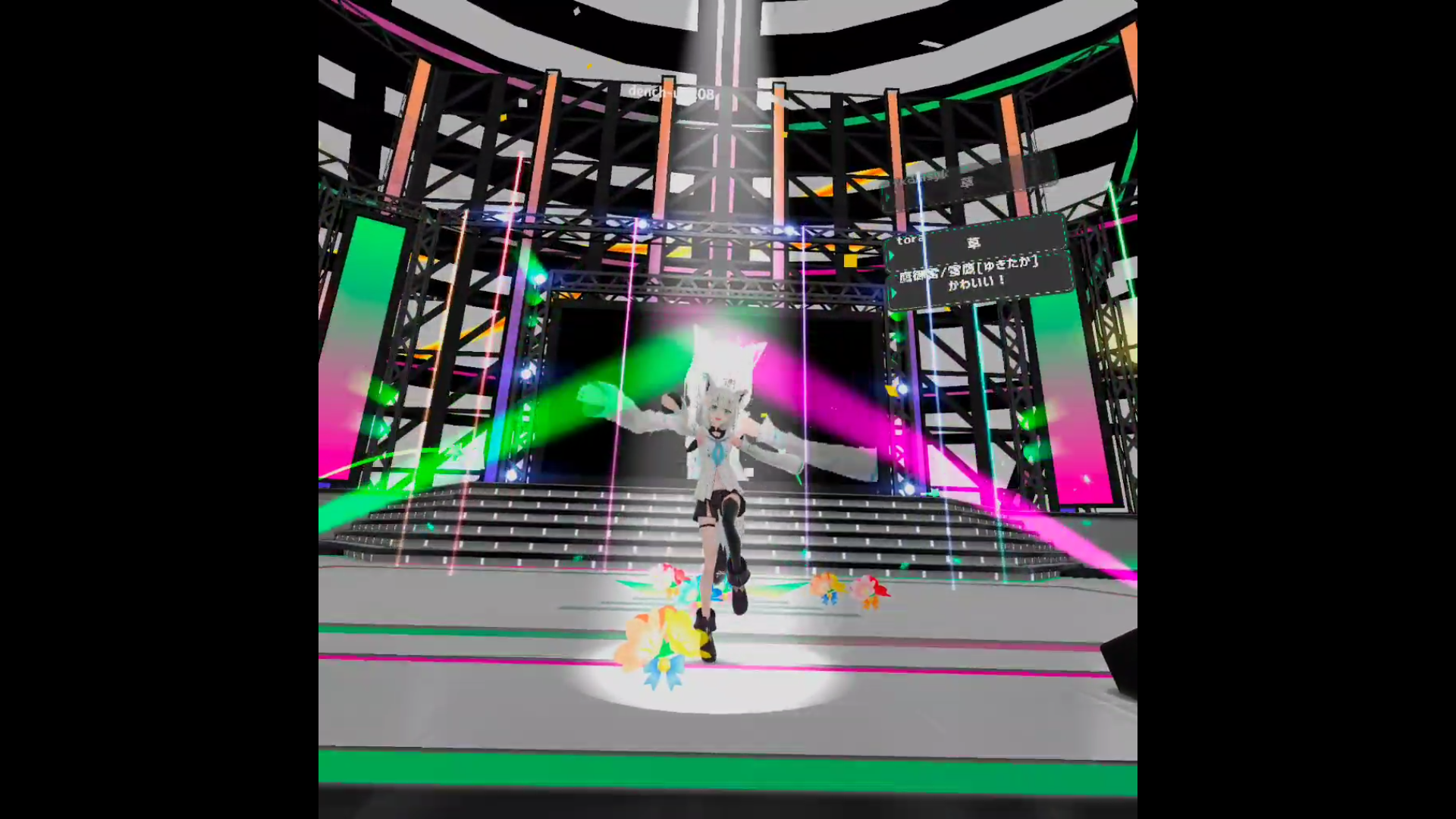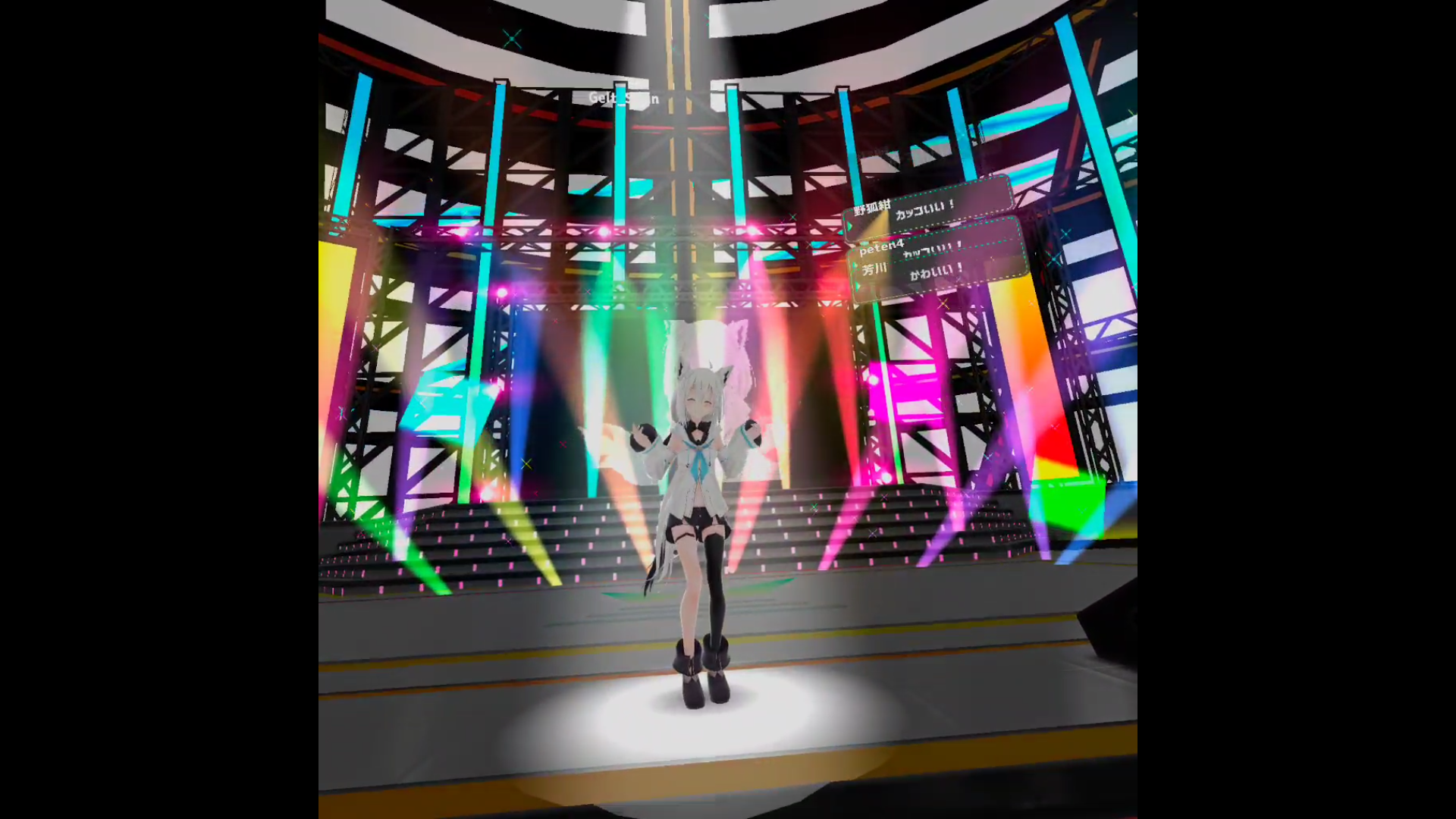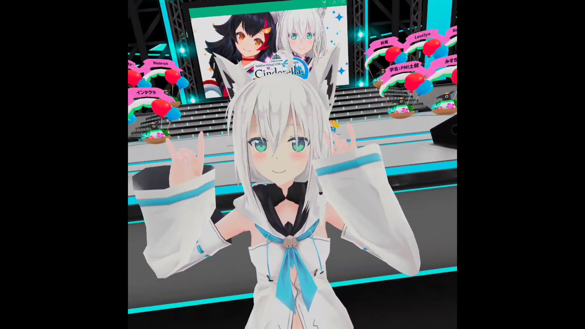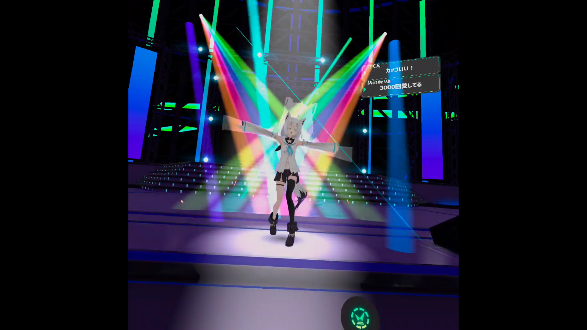 恒例のカウントダウンの後、フブキさんが登場すると、視聴者が飛ばせる有料ギフトの星が、まるで弾幕攻撃のようにステージ上のフブキさんに降り注ぐ。ステージ上ではしゃぐフブキさんと、楽しげな相方を笑顔で見つめるミオさんは、さっそく息の合った掛け合いを披露。「フブミオ」と自分が同じ空間に存在している不思議を最初のMCから感じられた。ミオさんと同じくVARKのライブに初参加のフブキさんは、さっそくVARK名物のガチ恋距離エリアに移動。手の届く場所に現れて、「お触り禁止だぞ〜」と言ったかと思えば、「頭をなでるくらいは許そう」と頭を差し出してくれる大サービス。