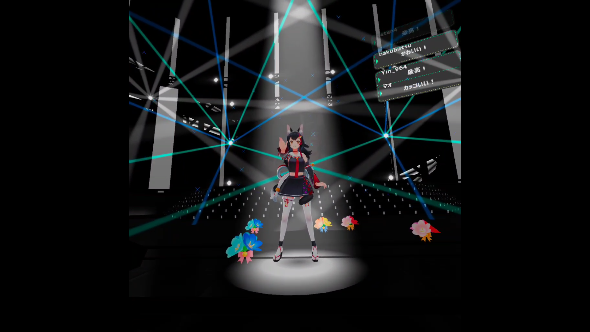 2人はいったんステージへ戻り、デジタルフラワースタンドなどを送った熱いファンへの感謝を述べたあと、お互いのセットリストを振り返りながら解説していく。フブキさんの4曲目「パレード」では、自分やミオさんだけでなく、周囲にいる観客アバターの持っているサイリウムも全部消えていて、面白い演出だと感心していたのだが、これはパレードを作詞、作曲した平沢進のライブではサイリウムが使用禁止のため、それに合わせる意味での演出とのこと。フブキさんらしいマニアックなこだわりだ。