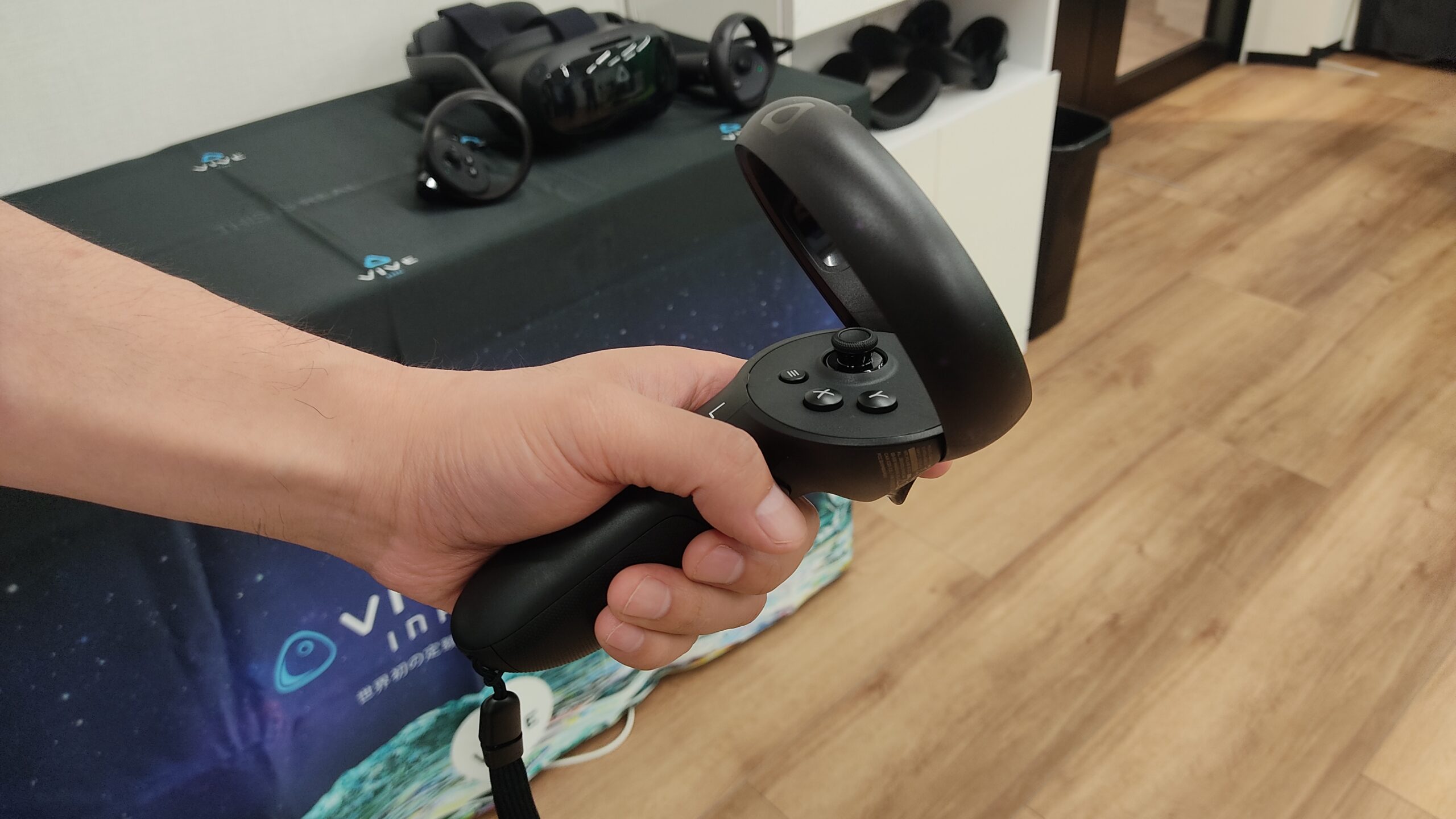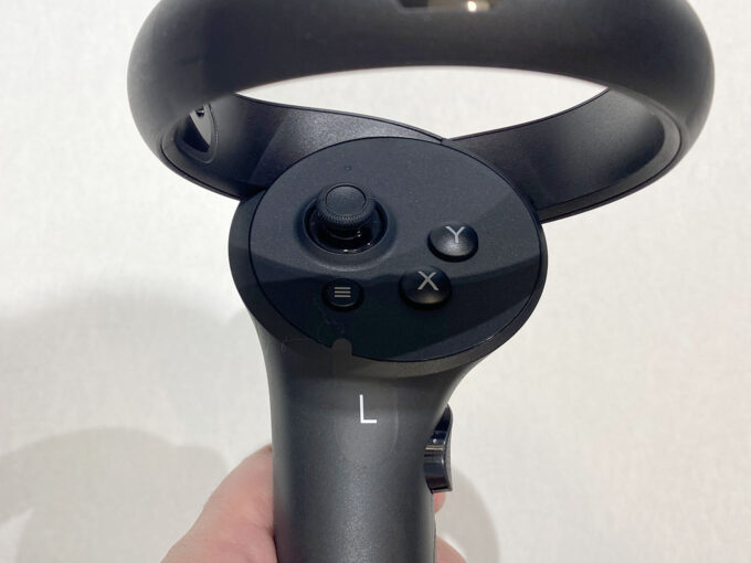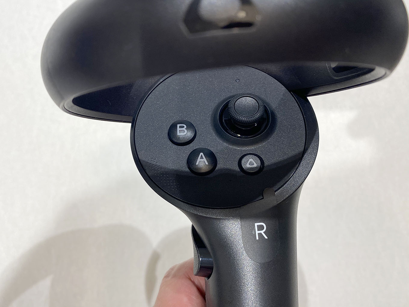 コントローラーもグレードアップしている。デザインは「Oculus Quest」のTouchコントローラーに近くなったイメージだ。しかし、実際に手にしてみると、Touchコントローラーよりも持ち手の部分が長く、全体的にひと回り大きいサイズ感であることがわかる。