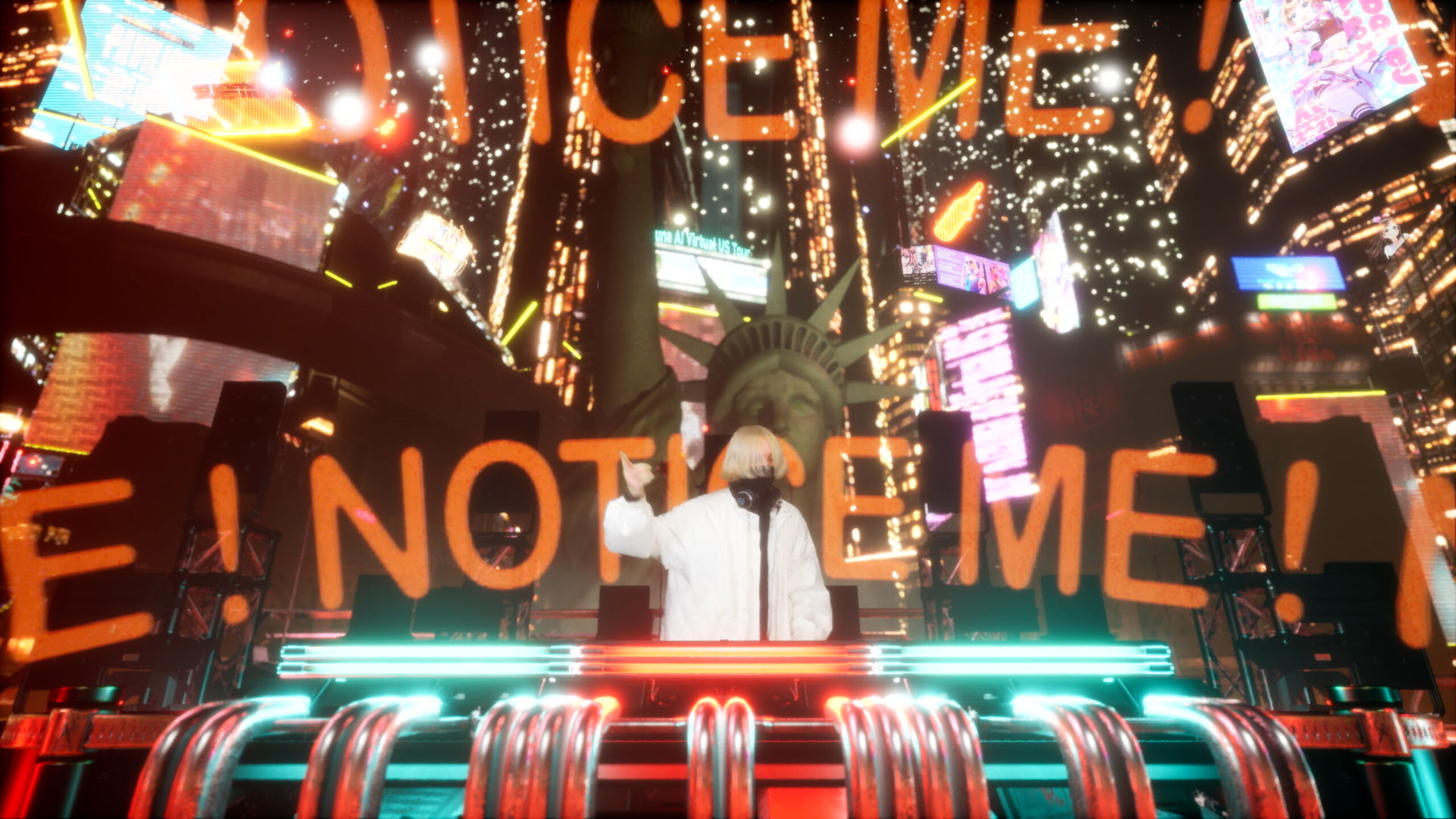 最終公演のライブは、クリエイティブチーム「Moment Tokyo x REZ&」が手掛けたバーチャルニューヨークをイメージした3D空間上で行われた全12曲で構成。1曲目に今回のツアーのメインテーマ的な位置づけとして起用されている「Hello World (TeddyLoid “Live” Remix)」のピアノとストリングスのイントロが流れると、「誰も見たことがない」広大な摩天楼の合間に浮かぶステージが映し出され、曲が激しいEDMサウンドに展開したタイミングで逆光でシルエットとなったアーティストKizuna AIが登場。