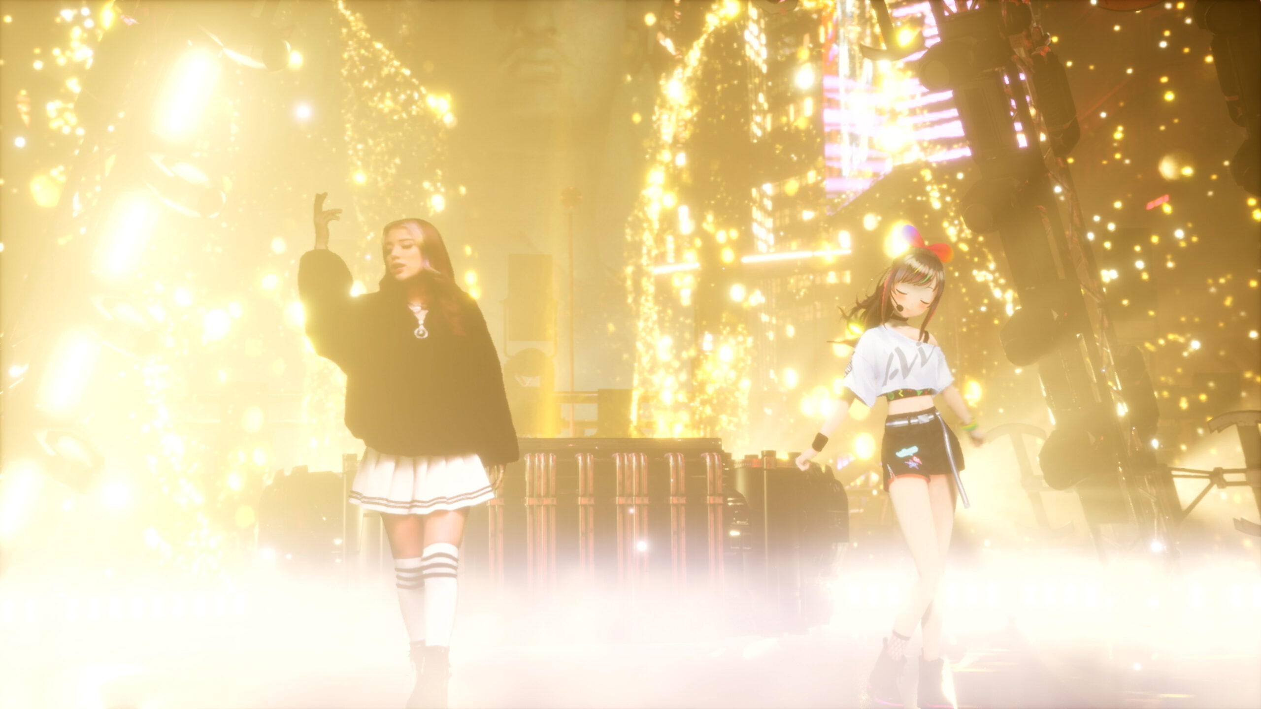 そして、バーチャル空間上にスタンドマイクが現れたかと思うと、元々バーチャルシンガー花譜とのコラボソングとしてリリースされた「かりそめ」を、この日初披露となったKizuna AIソロバージョンで歌い上げた。