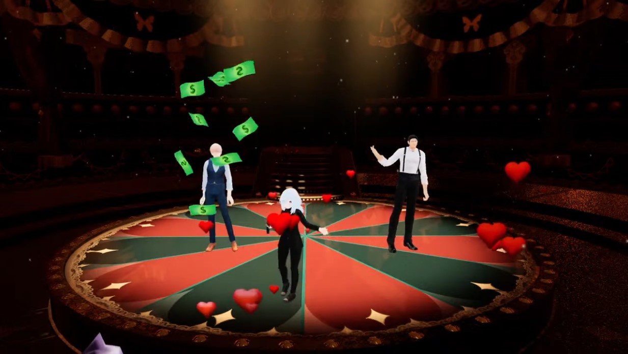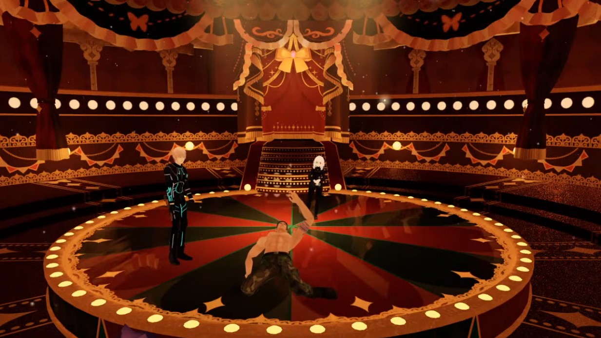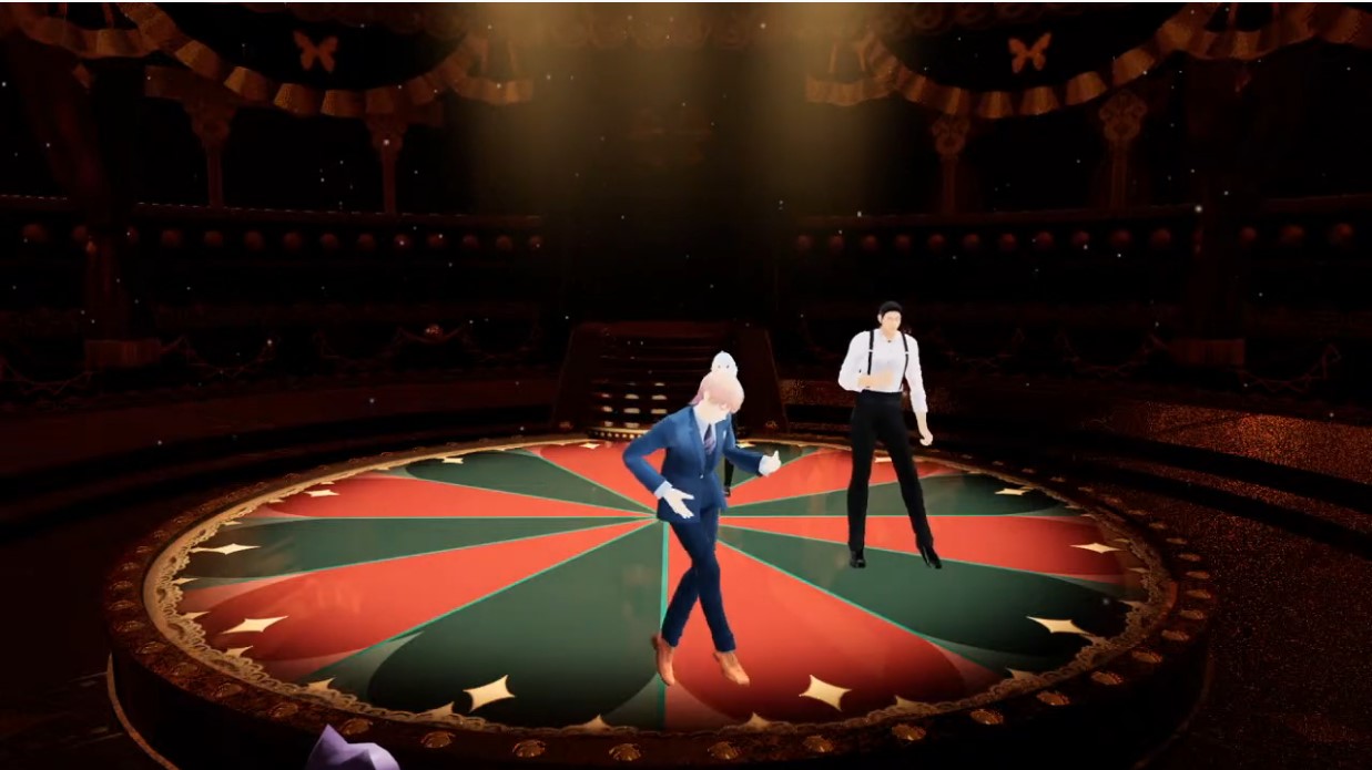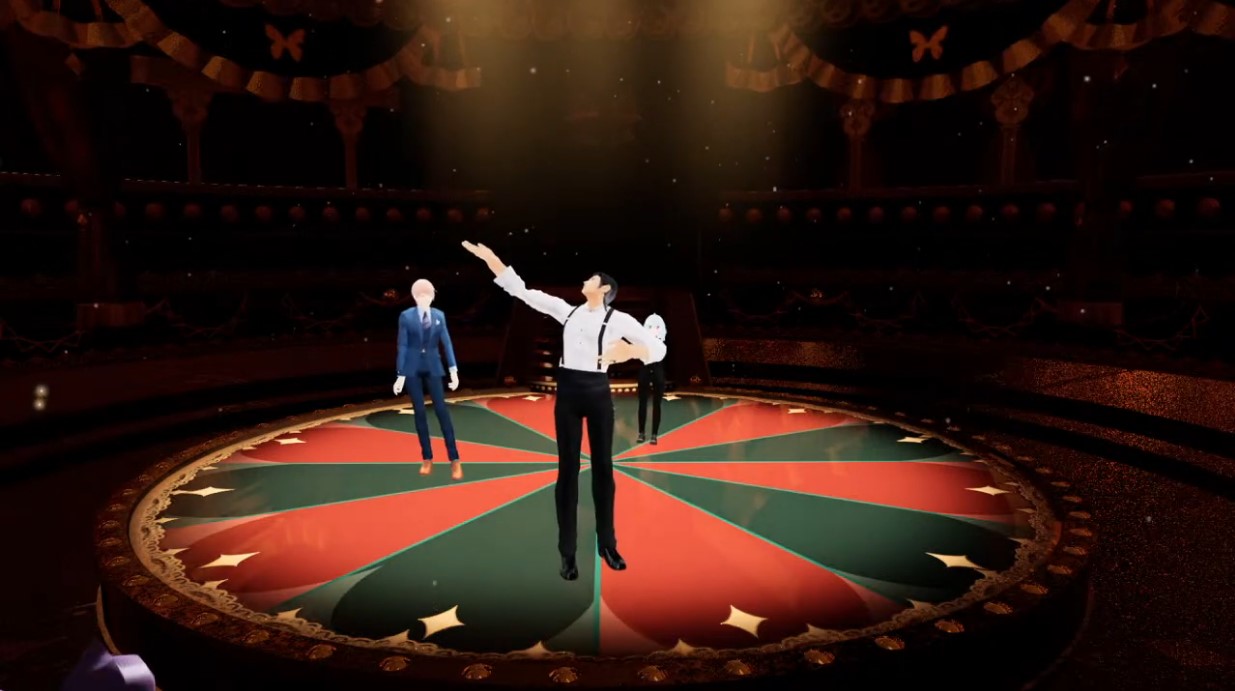 劇場はサーカスのテントのような構造になっており、会場中央には円型のステージが設置されている。室内の色味は赤や黒を基調としており、ヨーロッパの劇場を思わせるシックで高級感のある雰囲気。入場と同時に、一気に「劇場に来たんだ」と気が引き締まり、見る側ですら緊張してしまうほどにクオリティーが高い。公演前後にこうしたワールドの細部を眺められるところにも、VRで参加する意義は大きい。
