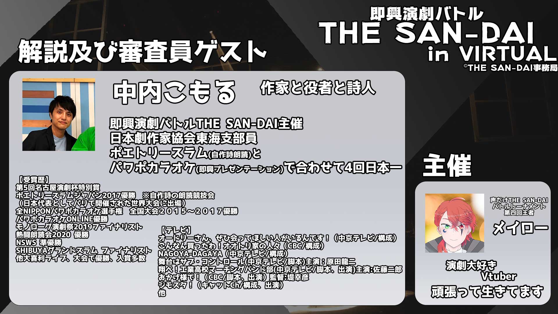解説及び審査員ゲストには、放送作家で自身も数多くの即興劇系のタイトルを獲得している中内こもるさんが出演する。以下、イベントの概要となる。