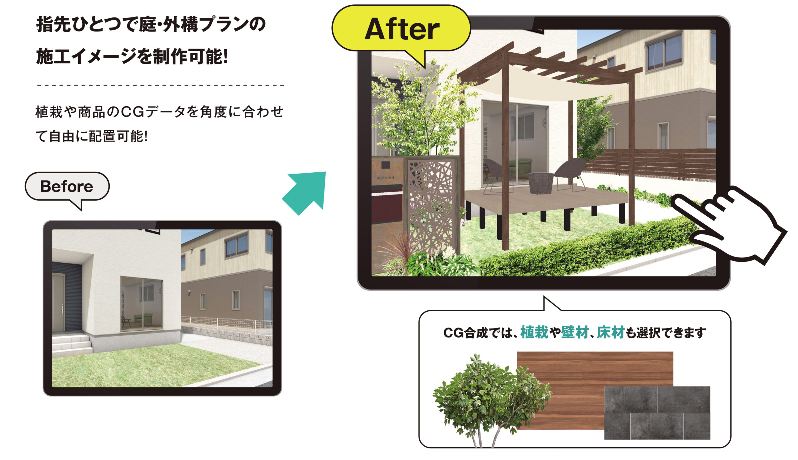 従来のAR機能は、庭や外構空間の現場で当社商品をAR設置することで、よりリアルなデジタル体感が可能。追加した「CG合成機能」では、その場にいなくてもお手持ちの庭や外構空間の写真やパース画像を使って簡単にCG合成ができる。