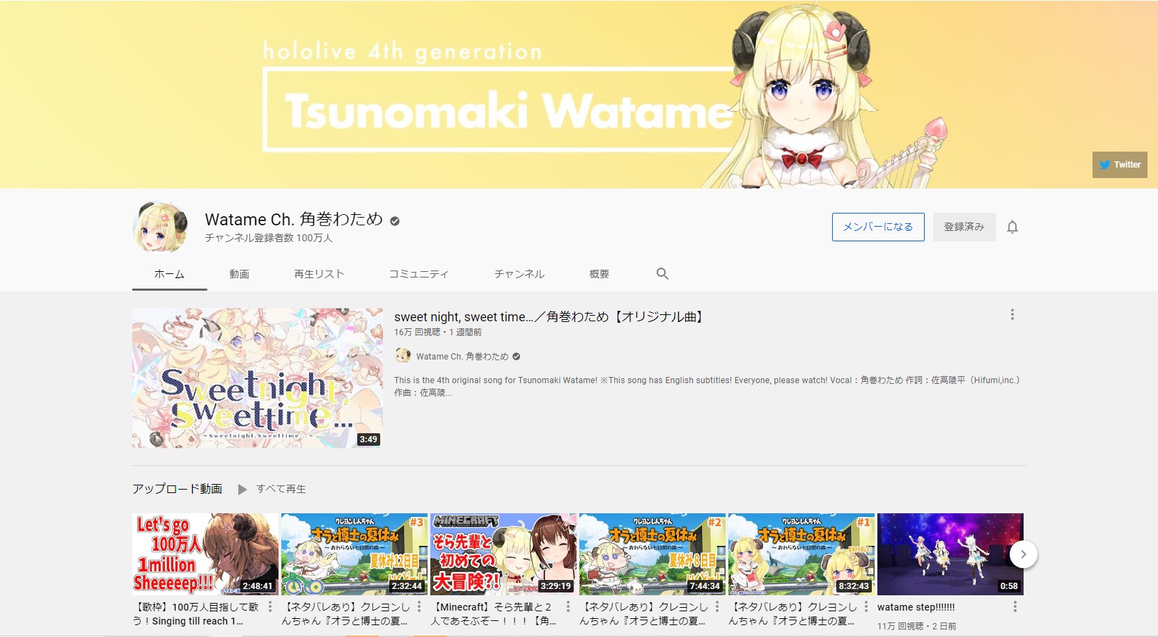 7月18日、VTuberグループ「ホロライブ」に所属する角巻わためさんのYouTubeチャンネル登録者数が100万を突破したことが明らかになった。チャンネル登録者数が100万人を超えたのは、VTuberとしては24人目、ホロライブとしては21人目の達成となる(関連記事)。