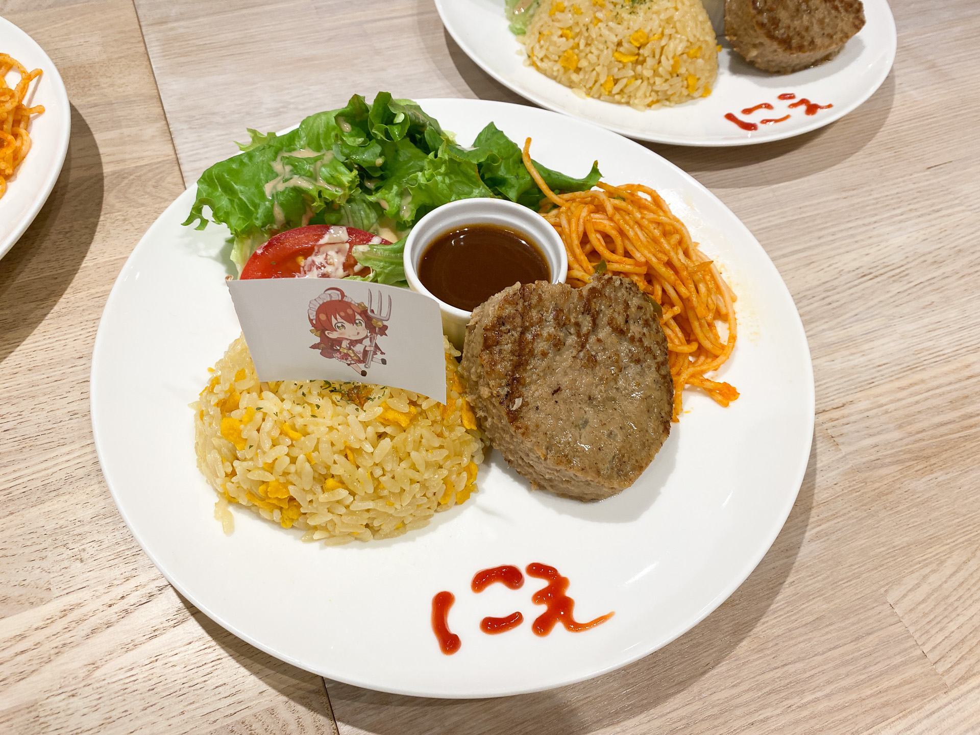 「えりぃとみこぴープレート 〜たくさんたべるにぇ!〜」(1500円、税込・以下同)。彼女の特徴的な語尾である「にぇ」のケチャップ文字が目を引く