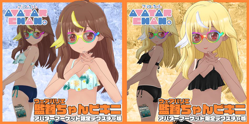 「ウェアバリエ 監督ちゃん ビキニ」は、「アバターちゃんシリーズ 第2弾アバター 監督ちゃん」の素体モデルをベースに、ビキニやサングラスといったアイテムを追加し、テクスチャーやマテリアルを調整および新規作成している。マテリアル数やポリゴン数を制約することで、さまざまなVRサービスで利用できるのが特徴だ。また、素体、顔、頭髪等の一部造形についてはテクスチャーやマテリアルをアバター間で相互に引き継げる。