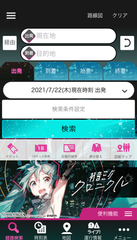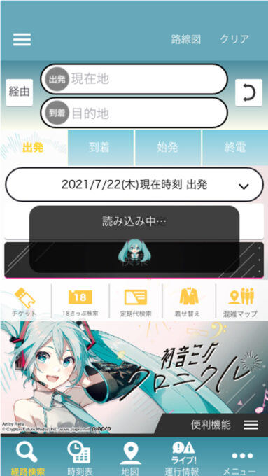 ジョルダンは「乗換案内」アプリにおいて、現在開催中のデジタルアート展「初音ミク・クロニクル」とのコラボを実施し、7月31日~8月22の期間限定で初音ミクの着せ替えテーマやコラボ機能を配信する。