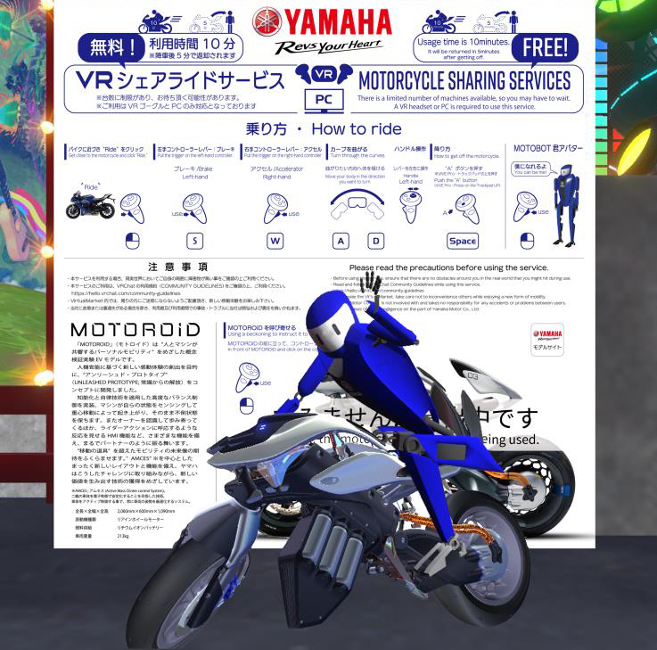 出品車両は、コンセプトモデル「MOTOROiD」(モトロイド)と、スーパースポーツのフラッグシップモデル「YZF-R1」。また、ヒト型自律ライディングロボット「MOTOBOT」(モトボット)の3Dアバターも用意。来場者はVRゴーグルを装着して仮想空間を走ることで、実車さながらのオートバイの動きやサウンド、爽快感などを体験できる。