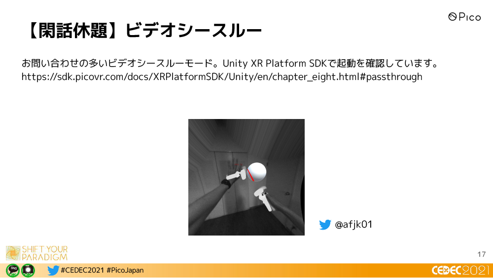 また、同じく良く聞かれることとしてビデオシースルーモードがあるが、こちらはUnity XR Platform上での動作が確認されているという。