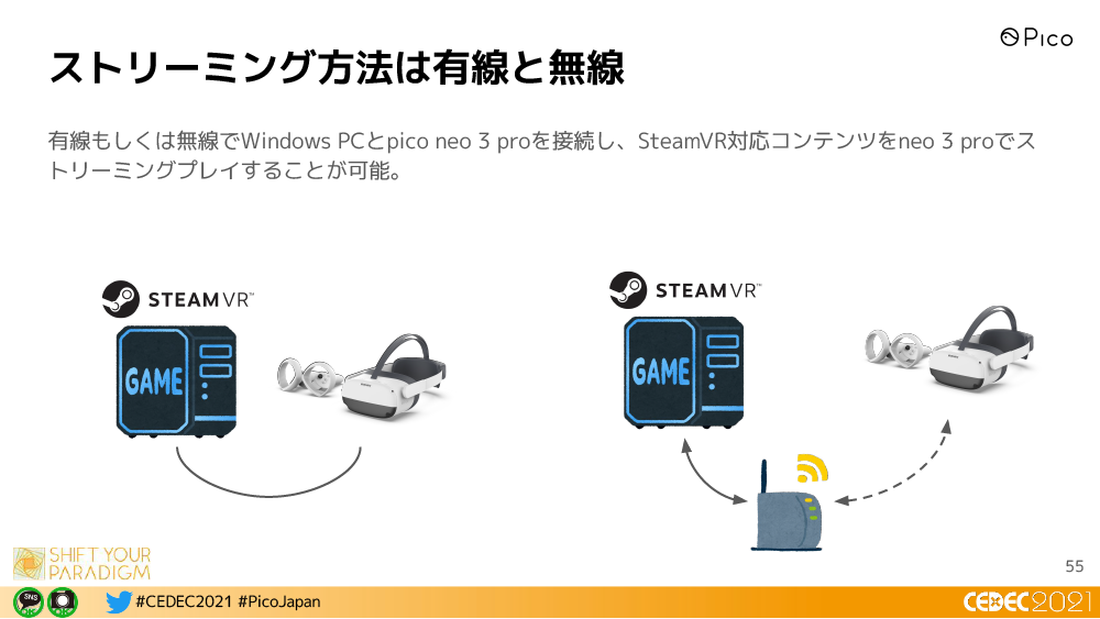 スタンドアロンデバイスとしてリリースされているPico neo 3 Proだが、実はPCとつないでSteam VRのヘッドセットしても利用できるという。有線・無線双方での接続に対応している。PCと接続するための専用のDisplayPortケーブルは日本では年内発売予定とのこと。