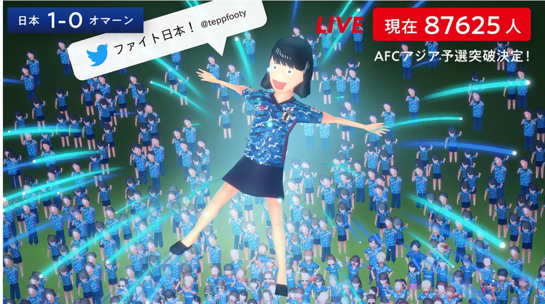 【内容】試合中、Twitterに応援メッセージを投稿すると、バーチャル上のスタジアムに応援アバターが出現し、大迫力の応援パフォーマンスを披露する。応援ツイート1つにつき、バーチャルスタジアム内の「応援アバター」が1体増えていく。