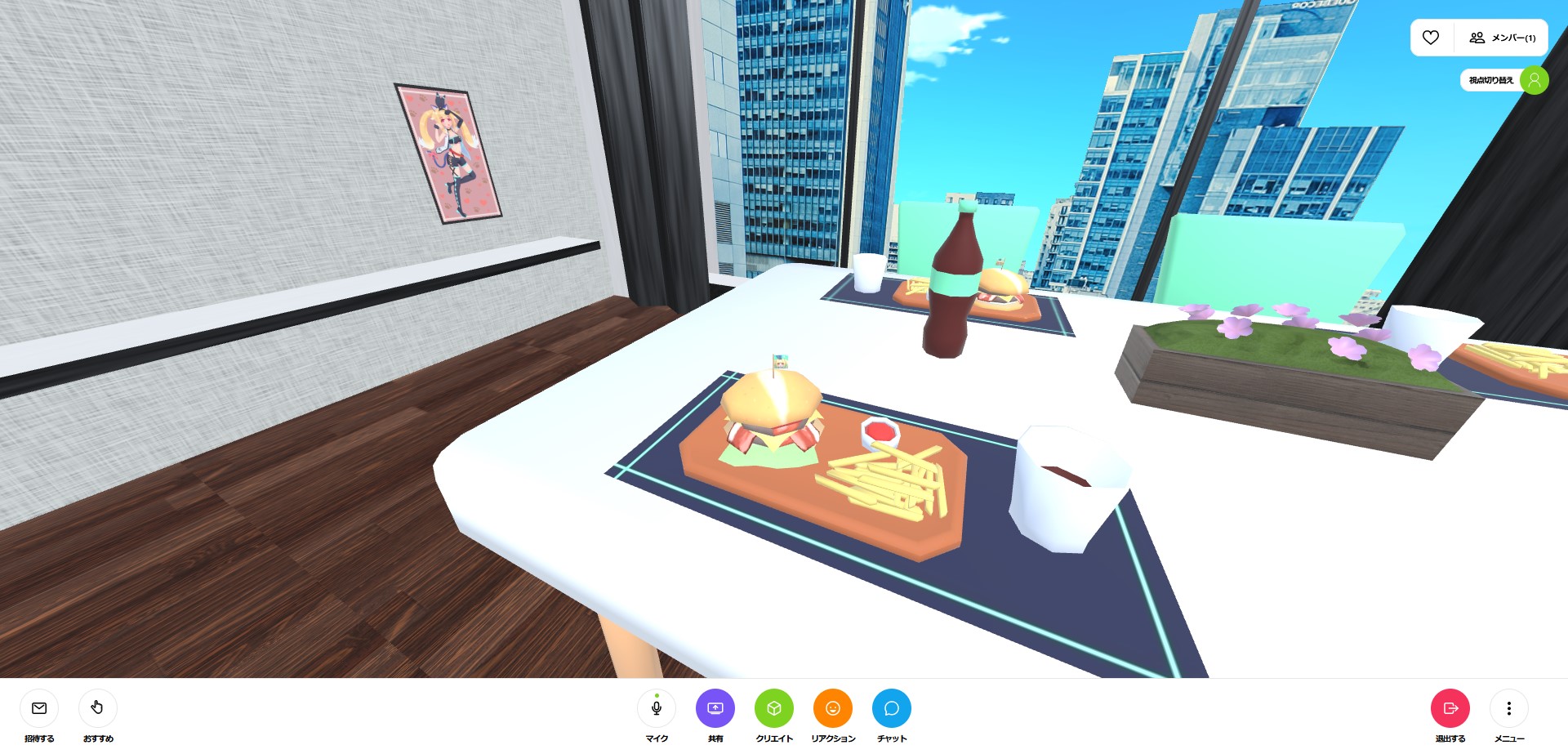 最後に紹介するのは、銀河アリスさんの「銀河市」よりどんぐりさん制作の「ユニヴェール・どんぐり 222号室」だ。ルームの様々な場所に、自作のファンアートが飾られており、本棚やハンバーガーに刺さっている旗など、かなり細かい部分もイラストで装飾されている。