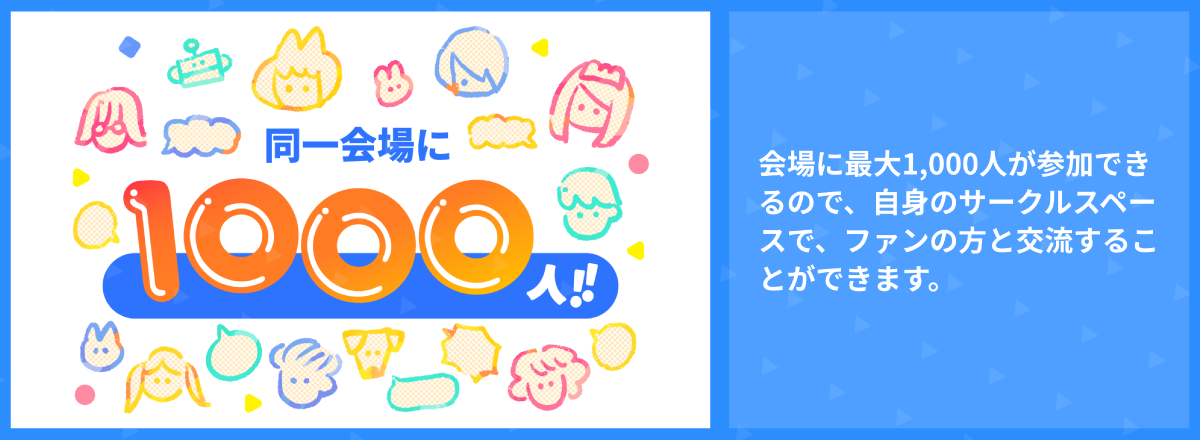 NEOKET内には複数の会場(ワールド)が存在する。1つの会場に同時に1000人、NEOKET全体では同時に1万人以上が参加可能だ。同一会場に同時に1000人が参加できることで、リアルな即売会のような感覚を味わえる。また、参加者同士は、ボイスチャットや3Dアバターのモーションを使って、直接コミュニケーションが可能。