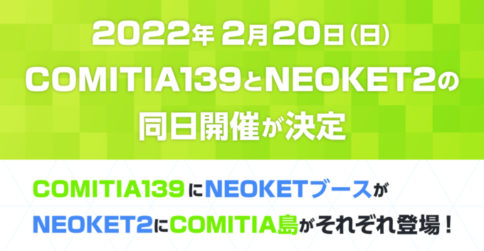 なお、2022年2月20日のNEOKET2は、同人誌即売会「COMITIA139」との同日開催となる。オンライン即売会NEOKETと、1984年から続いている同人誌即売会COMITIAが、それぞれの会場で即売会体験を提供することで、これからの創作活動をより活性化させたいという思いを込めているという。