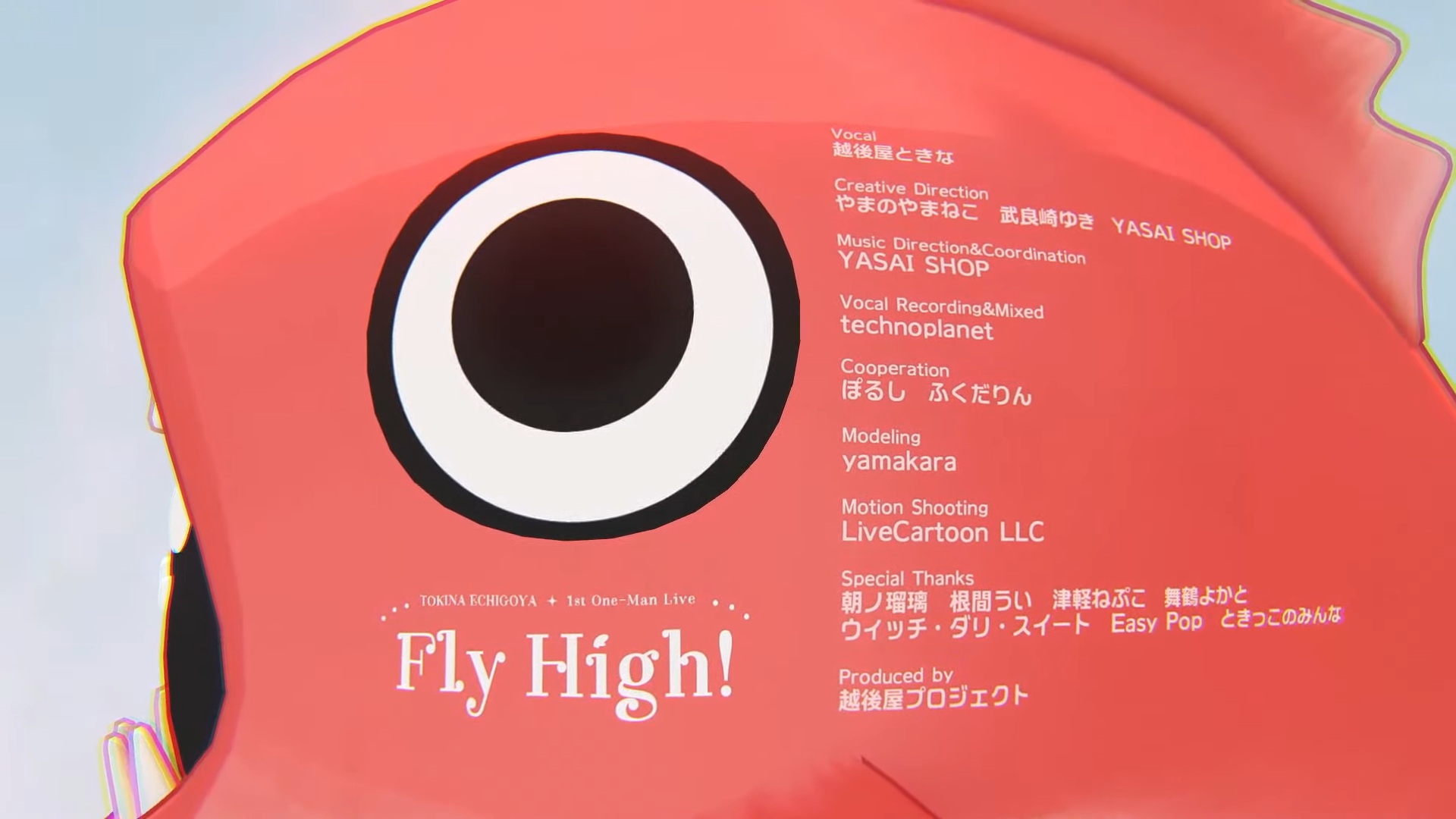 明るいあいさつとともに、1stワンマンライブを大成功させたときなが退場し、無人になったステージにのどぐろが現れる。何事かと思って見ていると、横を向いたのどぐろの身体の側面がアップになり、そこにはこのライブの制作に携わったクリエイターや、メッセージを送ったゲストたちの名前が。最後の最後まで、バーチャルライブならではの遊び心が楽しい。