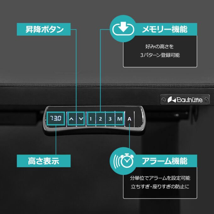高さ設定のメモリー機能を搭載しており、好みの高さ設定を3パターンまで登録できる。これにより、登録した高さにワンタッチのボタン操作で昇降可能だ。また、アラーム機能も搭載しており、プレイ時間の管理や座りすぎの防止に使える。