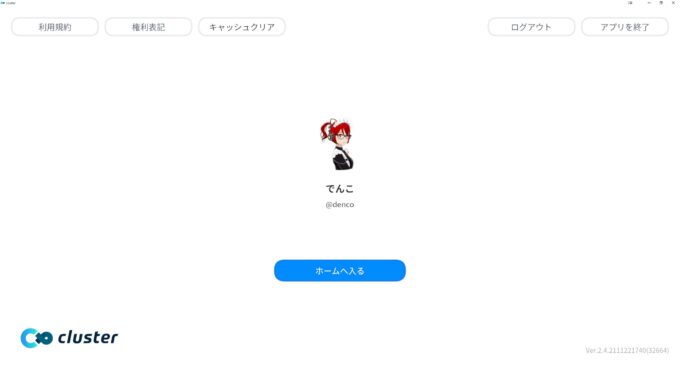 まずはclusterの「ホーム」にアクセスする。ホームはclusterの起動画面から選択するか、一度clusterのどこかのワールドに入った後に移動できる場所だ。