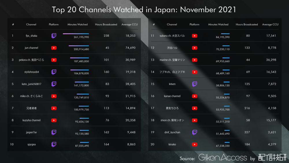 YouTubeやTwitch、OPENREC.tvなどを対象に同社のデータ解析ツール「Giken Access」で自社調査したもの。累計の視聴時間(Minutes Watched)のほか、総配信時間(Hours Broadcasted)や平均同時接続数(Average CCU)がわかる。上位20位は以下の通り。