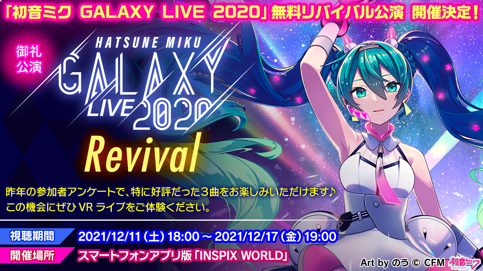 また、スマートフォンアプリ版「INSPIX WORLD」およびYouTubeで、昨年開催した「初音ミク GALAXY LIVE 2020」の無料リバイバル公演を実施する。