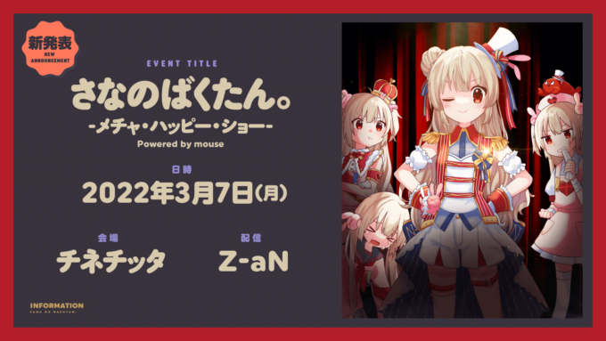 名取さなさんは12月12日、単独イベント「さなのばくたん。 -メチャ・ハッピー・ショー- Powered by mouse 」を、2022年3月7日にチネチッタ川崎にて開催することを発表した。配信はZ-aNにて行うとのこと。チケット価格や販売情報など詳細は後日の発表となる。
