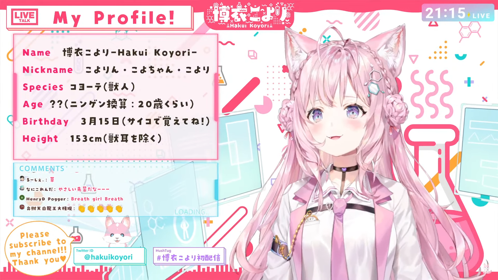 博衣こよりさんは自称「holoXの頭脳」。初配信ではパズル企画にしっかりとした自己紹介にタグ決めとたっぷりの内容を1時間きっちりに納め、直後に歌ってみた動画をプレミア公開とお手本のような初配信を披露。特技は滑舌に数字と謎解き。配信は歌にASMRにゲームと幅広くこなし、何ごとも元気に「実験」と称してチャレンジしていく努力家で、朝は苦手と言いつつ定期に「朝こよRaido」もしています。企画などをやっていきたいとのことで、初配信で早速6期生に求めることのアンケートを募集して配信で報告しました。