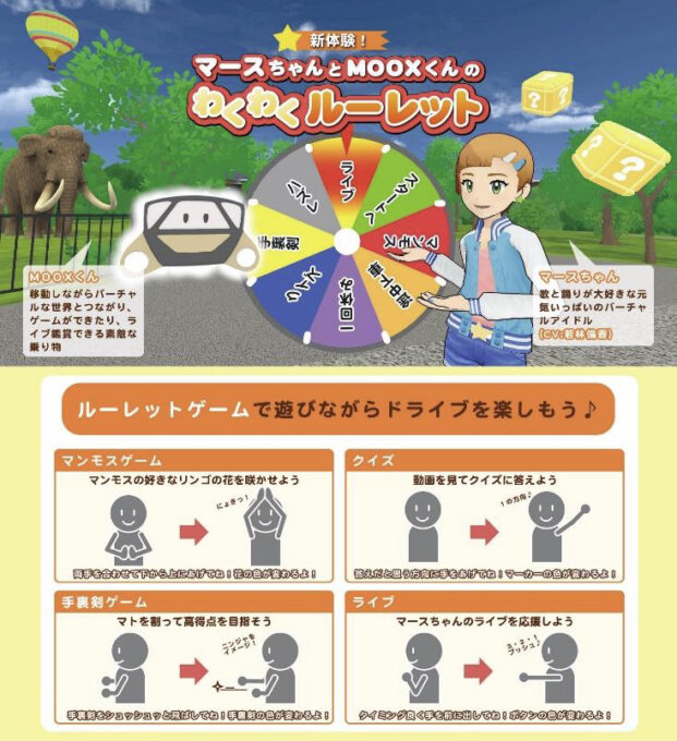 複数人が同時にインタラクティブに体験可能なコンテンツにより、新しい車室空間を体感してもらう。提供するのは下記のコンテンツ。