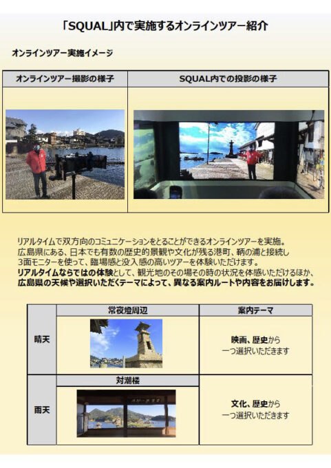 遠く離れた観光地(広島県福山市鞆の浦)とモリコロパークをドコモの5Gネットワークで接続し、車室内の三面の大型スクリーンを活用して臨場感あふれる観光地の様子を投影。実際にその場所を訪れたかのような体験ができる「オンラインツアー」を提供する。