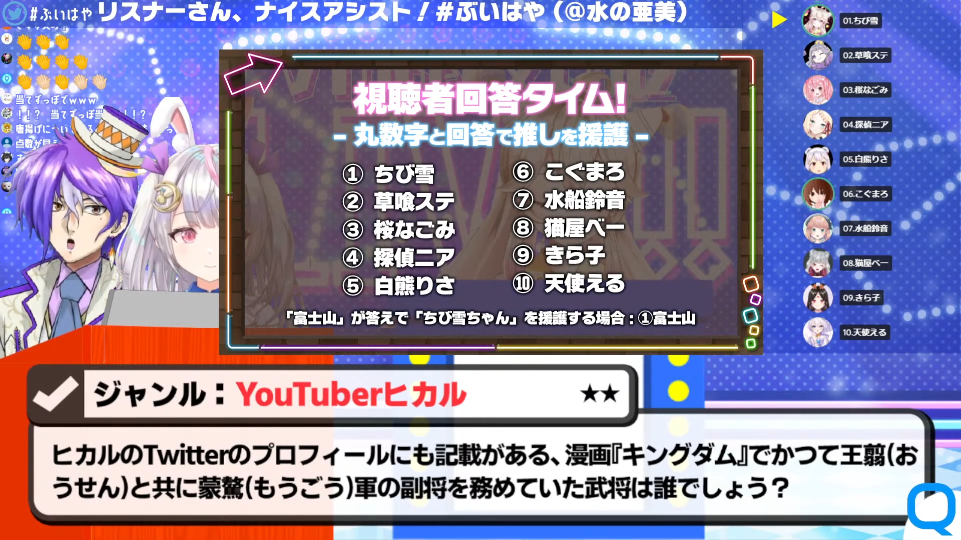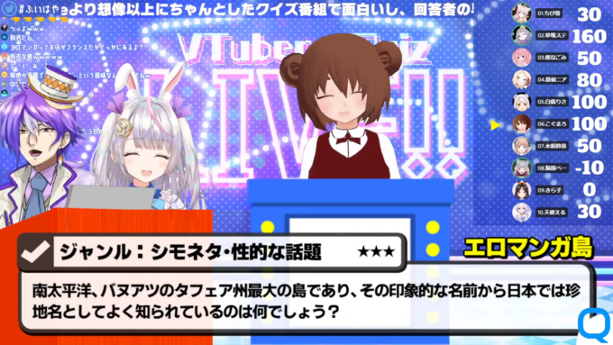 回答者だけでなく、視聴者もチャットで参加して推しを援護できる。VTuberたちが正解できなかった場合にチャット欄で答えを書き、その際にVTuberを指定して回答をすると、そのVTuberの得点になるというものだ。