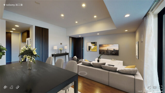 roOomyは、米国Matterport社の3Dウォークスルー動画との提携により、CG家具で演出された仮想空間を自由に歩き回り、あらゆる角度からの閲覧が可能で、従来と比べて臨場感の高いWeb内覧コンテンツを実現している。画像下のリンクより、サンプル動画でバーチャルホームステージングを体感できる。