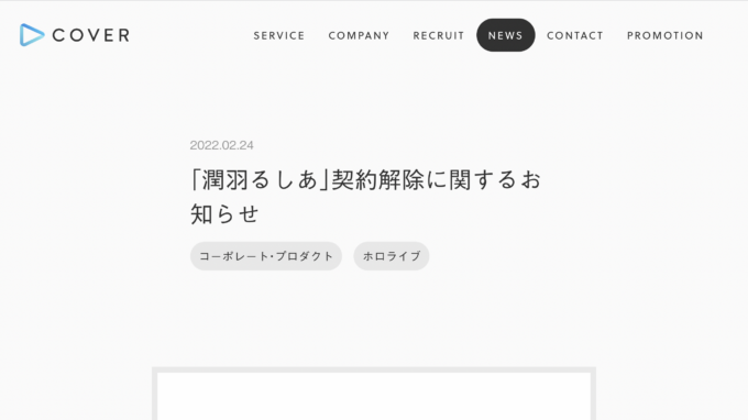 カバーは本日2月24日、女性VTuberグループ「ホロライブ」所属のVTuber・潤羽るしあとのタレント契約を解除したと発表した。