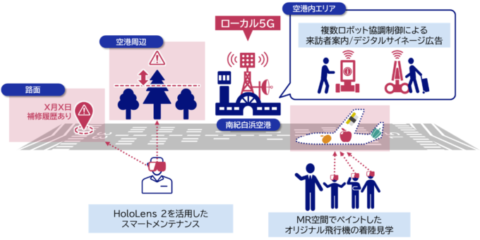 今回、南紀白浜空港の空港ターミナルビル内とエプロン(航空機の駐機場)、滑走路周りの場周道路を対象に、高速大容量・低遅延なローカル5Gネットワーク環境を構築し、以下の3つの実証実験を行う。