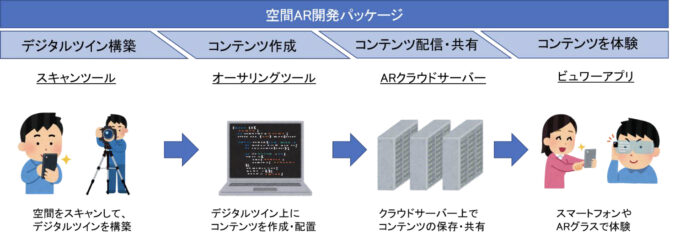 本パッケージは、デジタルツインを構築するためのスキャンツール、コンテンツを作成し配置するためのオーサリングツールや、コンテンツを配信・共有するためのARクラウドサーバー、および空間ARコンテンツを体験するためのビュワーアプリの4つで構成。ビューアーアプリは、複数の自己位置推定技術やプラットフォームに対応しており、さまざまな環境や体験内容に合わせて提供できる。