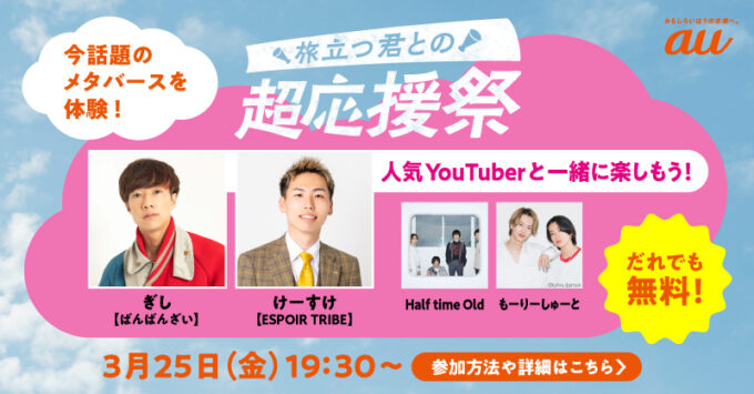 KDDI は、卒業や新成人など「旅立ち」を迎える学生・若者に向けて2月9日より実施してきた「旅立つ君との超応援祭」のフィナーレとして、3月25日にバーチャルライブを「バーチャル大阪」の特設会場にて開催すると発表した。