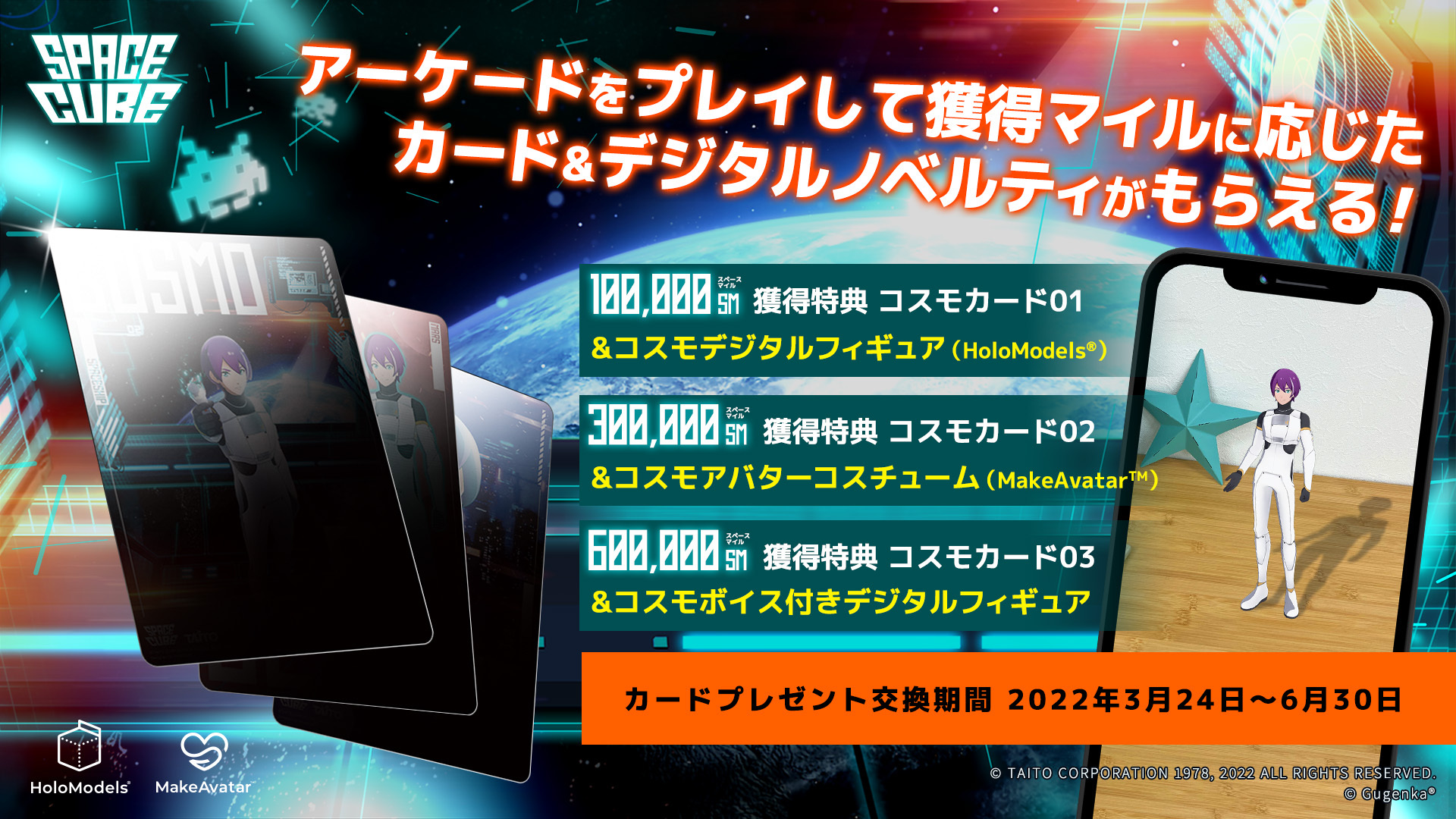 Gugenkaは、タイトーの体験型アトラクション「SPACECUBE」をプレイしてためることができる「スペースマイル」と、デジタルフィギュアビューアーアプリ「HoloModels」およびアバター制作アプリ「MakeAvatar」のデジタルグッズを交換できるキャンペーンを開始した。