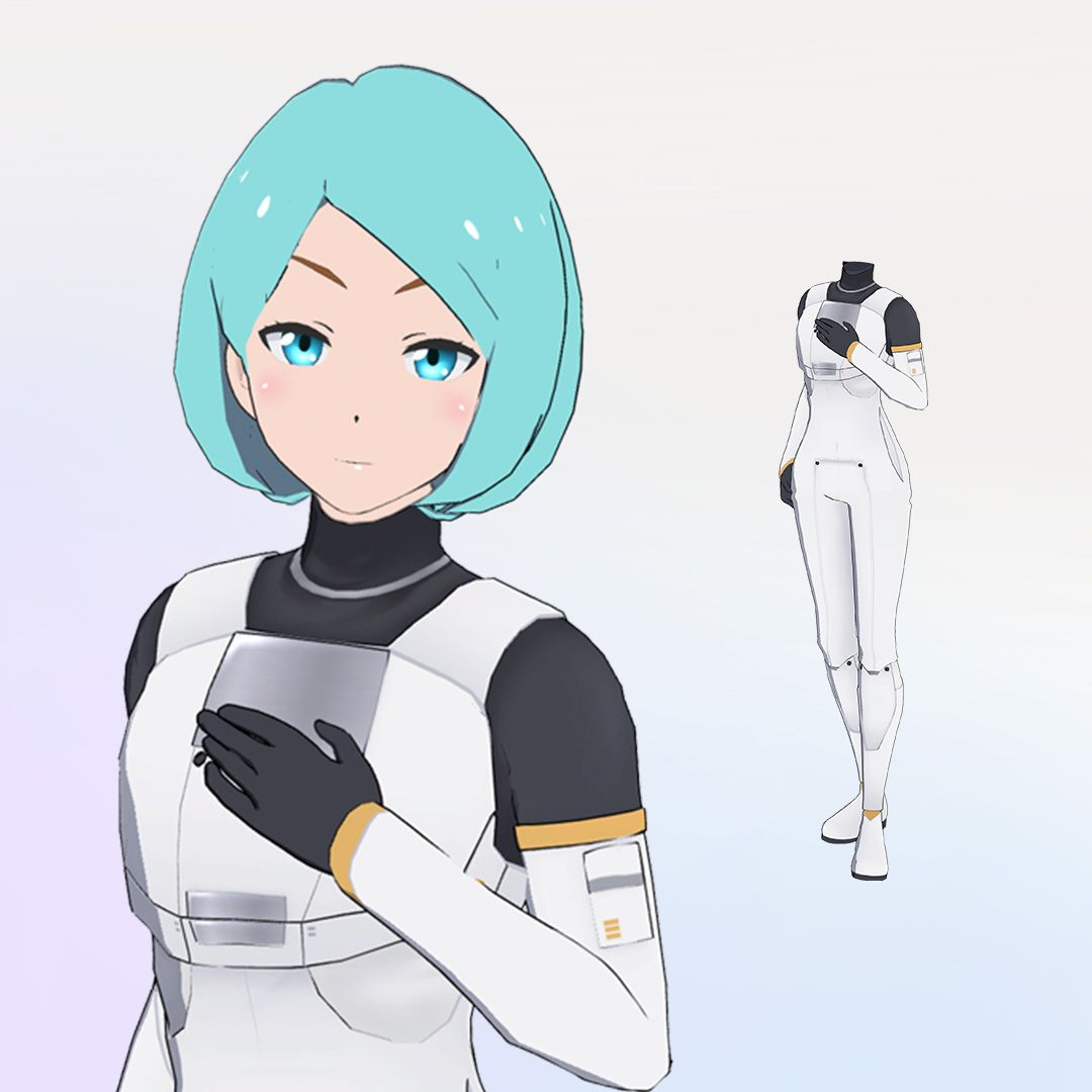 案内兼試験官のコスモが着用している宇宙服をイメージしたアバター衣装。MakeAvatarで自分の作ったアバターに宇宙服を着せかえて、バーチャル世界へ遊びに行くことができる。