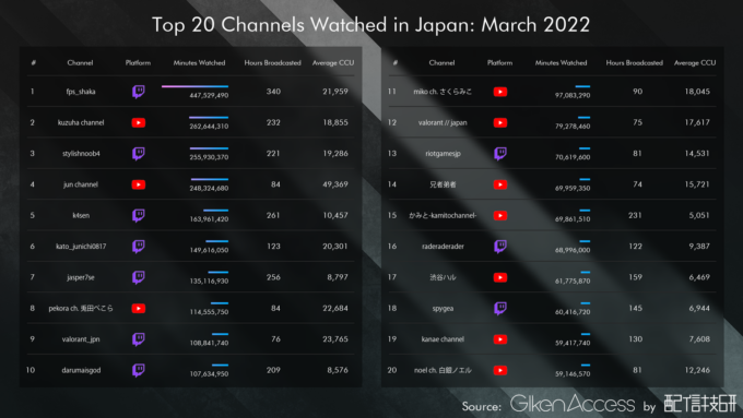 配信技研は4月1日、日本のゲームカテゴリーにおけるライブ配信視聴で上位20チャンネルを算出した2022年3月版ランキングを発表した。