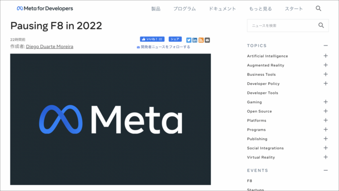 米国Meta社(旧Facebook)は4月6日(現地時間)、2022年は開発者向けカンファレンス「F8」を開催しないと発表した。