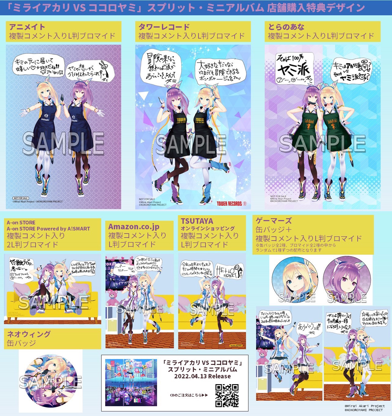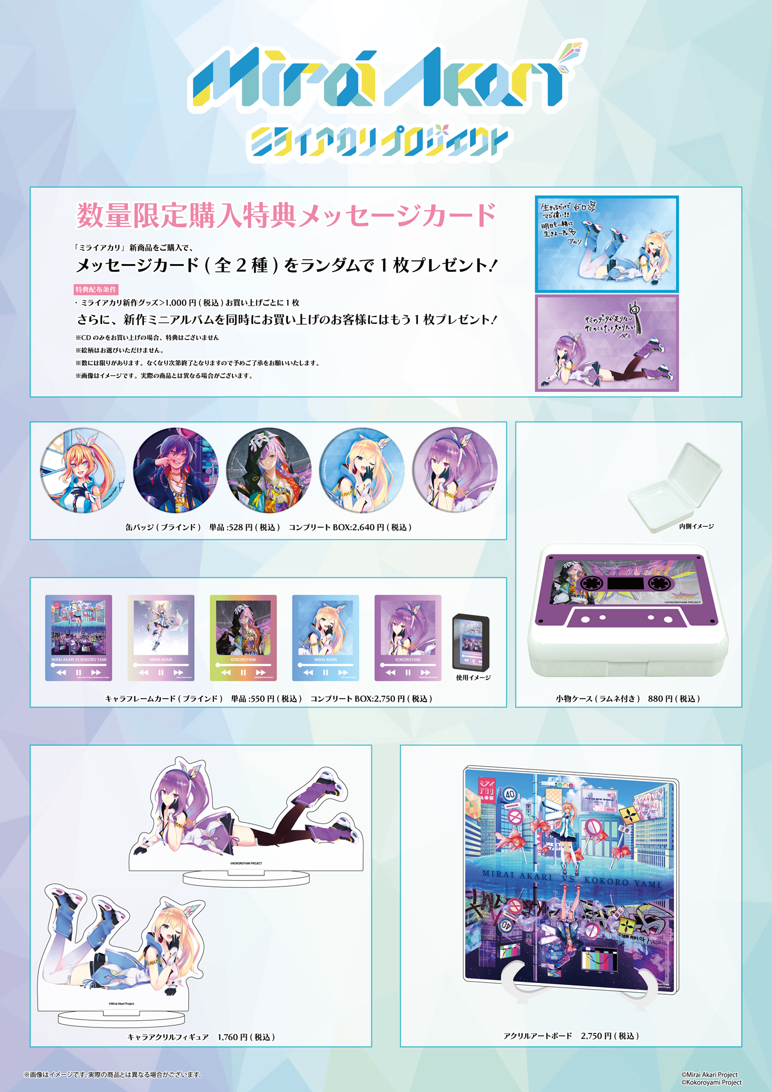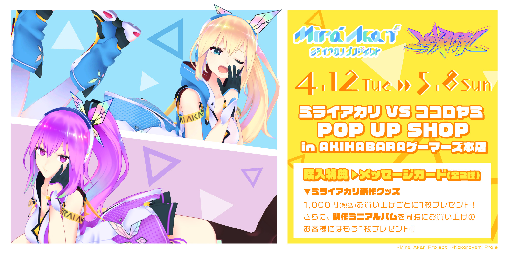 「ミライアカリ VS ココロヤミ」ミニアルバム発売記念商品を販売。新作CDのジャケットを使用した商品をはじめ、撮りおろしの寝ころび写真を使用した商品も多数ラインナップ。開催期間中に『ミライアカリ』新商品を1会計1000円(税込)お買い上げごとに、特典メッセージカードをランダムに1枚プレゼント。さらに新作ミニアルバムを同時にお買い上げのお客様には、メッセージカードをもう1枚プレゼントする(※通販ではグッズのみ特典が付く)。