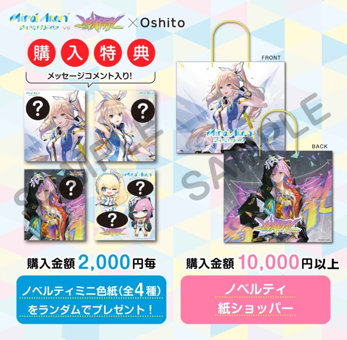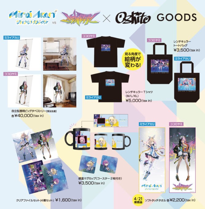 4月13日発売のアルバム『ミライアカリVSココロヤミ』を記念して、ミライアカリ、ココロヤミとCreators’ Merch “Oshito”のコラボを開催。コラボ記念グッズの販売を始め、コラボ限定オリジナル特典や特別展示、巨大ターポリンバナー掲示など、アカリちゃんヤミちゃんを感じられるコラボを展開予定。