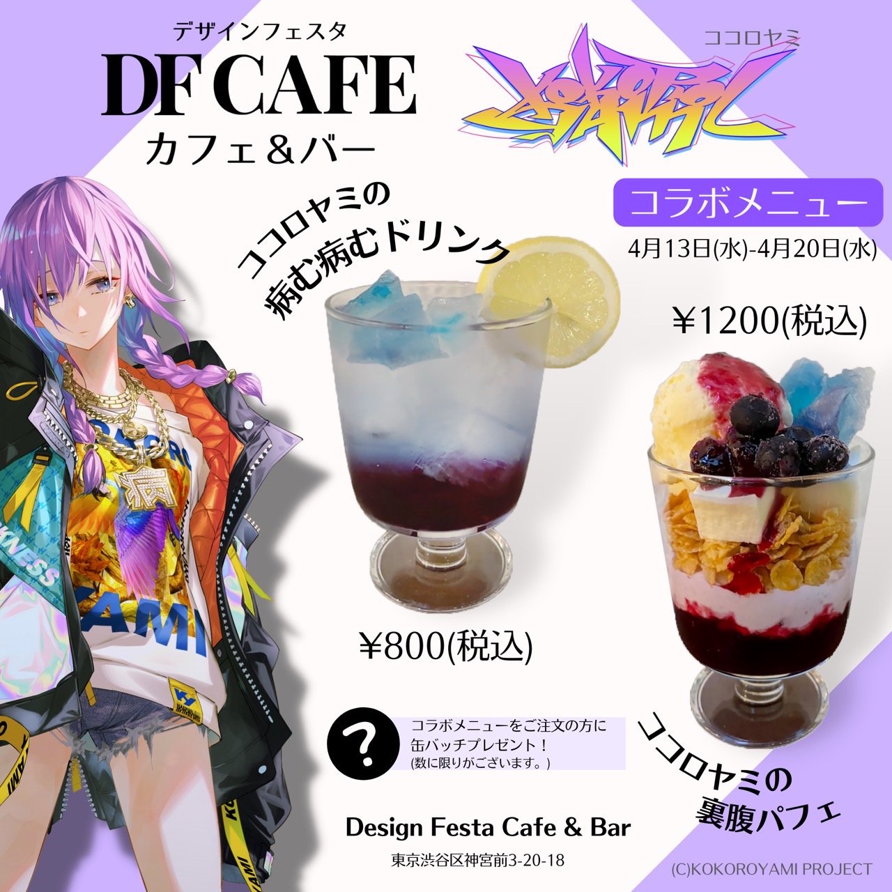 ココロヤミのグラフィティアートが壁面に描かれているデザインフェスタギャラリー原宿に併設のカフェ&バー「DE CAFE」にて、コラボフードとドリンクを販売する。グラフィティアートを眺めながら飲食可能なテラス席もあり、コラボメニューをご注文した人には限定デザインの缶バッジをプレゼント(※なくなり次第終了)。