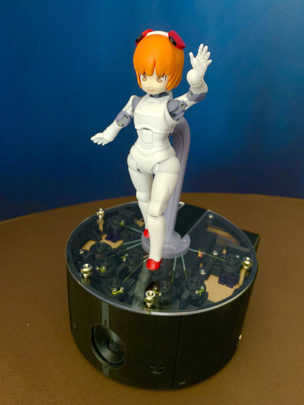 「フィギュア3.0クレア」は身長14cmのロボットフィギュアで、自由度の高い骨格と自走式のからくりユニット(台座)を持ち、バッテリー駆動も可能な重量950gの携帯型フィギュアシステム。情報のリアル3D表現を得意とし、メタバースなど仮想世界の情報を人にやさしく伝えることができる。また基本ソフトとして、スマホなどのアイコンで遠隔地からもメッセンジャー感覚で容易にロボットの操作が可能な「ロボスタンプ」を提供する。