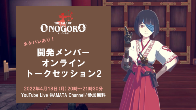 あまたは、新作VRアクションアドベンチャーゲーム「オノゴロ物語 ~The Tale of Onogoro~」の開発メンバーによるオンライントークセッションの第2弾を、4月18日に開催すると発表した。