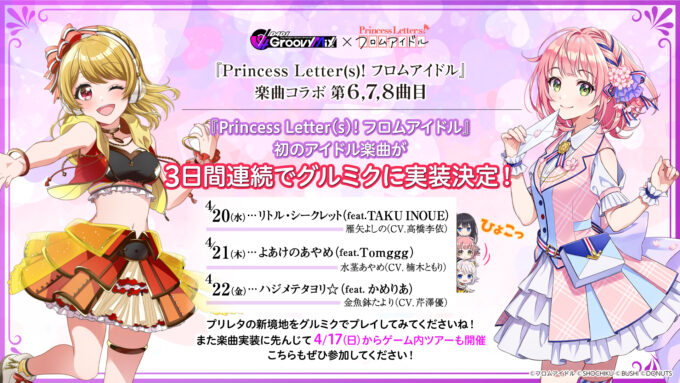 スマートフォン向けリズムゲーム「D4DJ Groovy Mix」(グルミク)に、プリレタの楽曲が4月20日から3日間連続で実装されることが決定。今回でグルミクに実装されるプリレタの楽曲は計8曲となる。