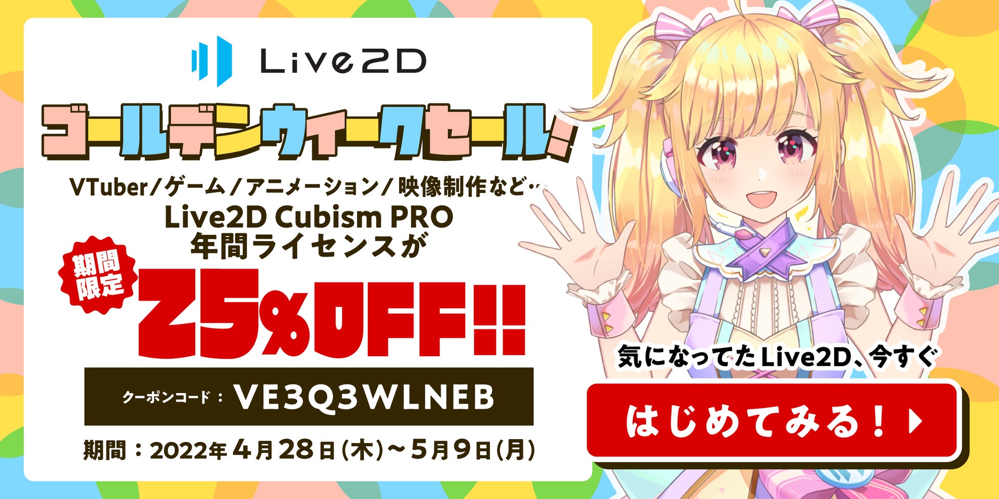 2Dイラストを立体的に動かすソフトウェア「Live2D Cubism(ライブツーディー キュビズム)」の開発・販売を行う株式会社Live2D(本社:東京都新宿区、代表取締役:中城哲也、以下、Live2D社)は、2022年4月28日(木)から2022年5月9日(月)までの12日間「Live2D ゴールデンウィークセール」を開催します。『Live2D Cubism PRO 年間プラン』が25%OFFで購入できるお得なチャンスをお見逃しなく!2022年4月28日(木)~2022年5月9日(月)の12日間限定で『Live2D Cubism PRO ライセンス』が25%OFFでご購入頂けるクーポンを配布します!