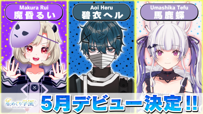 VTuberグループの星めぐり学園は6日、オーディションを突破した碧衣ヘル(あおいへる)、馬鹿蝶(うましかてふ)、魔昏るい(まくらるい)の3名が新入生としてデビューすることを明らかにした。初配信は5月15日となる。